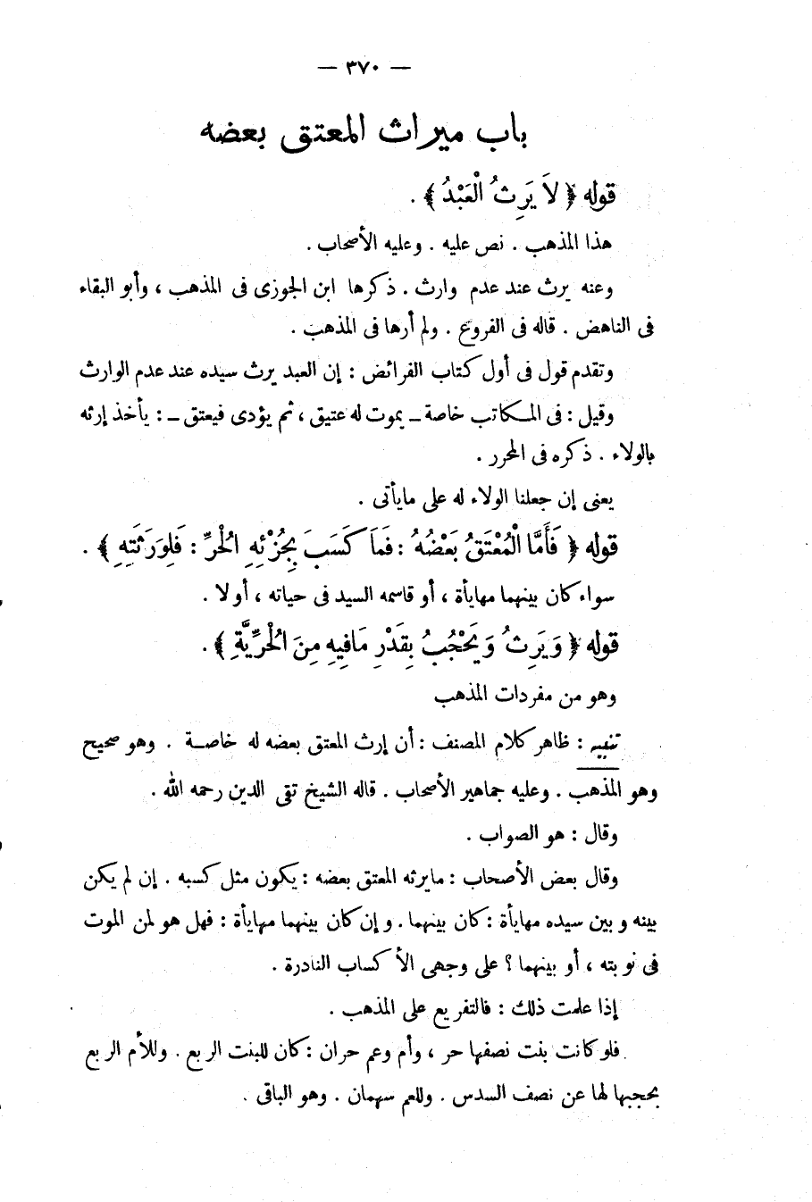 تَنْبِيهٌ: ظَاهِرُ كَلَامِ الْمُصَنِّفِ: أَنَّ إرْثَ الْمُعْتَقِ بَعْضُهُ لَهُ خَاصَّةً. وَهُوَ صَحِيحٌ وَهُوَ الْمَذْهَبُ. وَعَلَيْهِ جَمَاهِيرُ الْأَصْحَابِ. قَالَهُ الشَّيْخُ تَقِيُّ الدِّينِ - رَحِمَهُ اللَّهُ -. وَقَالَ: هُوَ الصَّوَابُ. وَقَالَ بَعْضُ الْأَصْحَابِ: مَا يَرِثُهُ الْمُعْتَقُ بَعْضُهُ: يَكُونُ مِثْلَ كَسْبِهِ. إنْ لَمْ يَكُنْ بَيْنَهُ وَبَيْنَ سَيِّدِهِ مُهَايَأَةٌ: كَانَ بَيْنَهُمَا. وَإِنْ كَانَ بَيْنَهُمَا مُهَايَأَةٌ: فَهَلْ هُوَ لِمَنْ الْمَوْتُ فِي نَوْبَتِهِ، أَوْ بَيْنَهُمَا؟ عَلَى وَجْهَيْ الْأَكْسَابِ النَّادِرَةِ. إذَا عَلِمْت ذَلِكَ: فَالتَّفْرِيعُ عَلَى الْمَذْهَبِ. فَلَوْ كَانَتْ بِنْتٌ نِصْفُهَا حُرٌّ، وَأُمٌّ وَعَمٌّ حُرَّانِ: كَانَ لِلْبِنْتِ الرُّبُعُ. وَلِلْأُمِّ الرُّبُعُ بِحَجْبِهَا لَهَا عَنْ نِصْفِ السُّدُسِ. وَلِلْعَمِّ سَهْمَانِ. وَهُوَ الْبَاقِي.