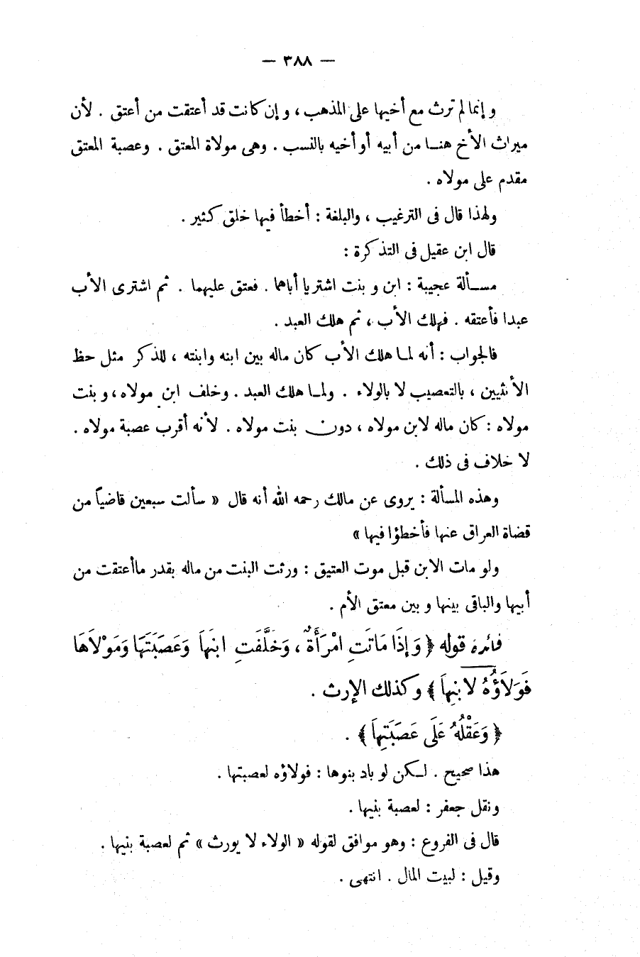 فَالْجَوَابُ: أَنَّهُ لَمَّا هَلَكَ الْأَبُ كَانَ مَالُهُ بَيْنَ ابْنِهِ وَابْنَتِهِ، لِلذَّكَرِ مِثْلُ حَظِّ الْأُنْثَيَيْنِ، بِالتَّعْصِيبِ لَا بِالْوَلَاءِ. وَلَمَّا هَلَكَ الْعَبْدُ. وَخَلَّفَ ابْنَ مَوْلَاهُ، وَبِنْتَ مَوْلَاهُ: كَانَ مَالُهُ لِابْنِ مَوْلَاهُ، دُونَ بِنْتِ مَوْلَاهُ. لِأَنَّهُ أَقْرَبُ عَصَبَةِ مَوْلَاهُ. لَا خِلَافَ فِي ذَلِكَ. وَهَذِهِ الْمَسْأَلَةُ: يُرْوَى عَنْ مَالِكٍ - رَحِمَهُ اللَّهُ - أَنَّهُ قَالَ " سَأَلْت سَبْعِينَ قَاضِيًا مِنْ قُضَاةِ الْعِرَاقِ عَنْهَا فَأَخْطَئُوا فِيهَا " وَلَوْ مَاتَ الِابْنُ قَبْلَ مَوْتِ الْعَتِيقِ: وَرِثَتْ الْبِنْتُ مِنْ مَالِهِ بِقَدْرِ مَا أَعْتَقَتْ مِنْ أَبِيهَا وَالْبَاقِي بَيْنَهَا وَبَيْنَ مُعْتِقِ الْأُمِّ.