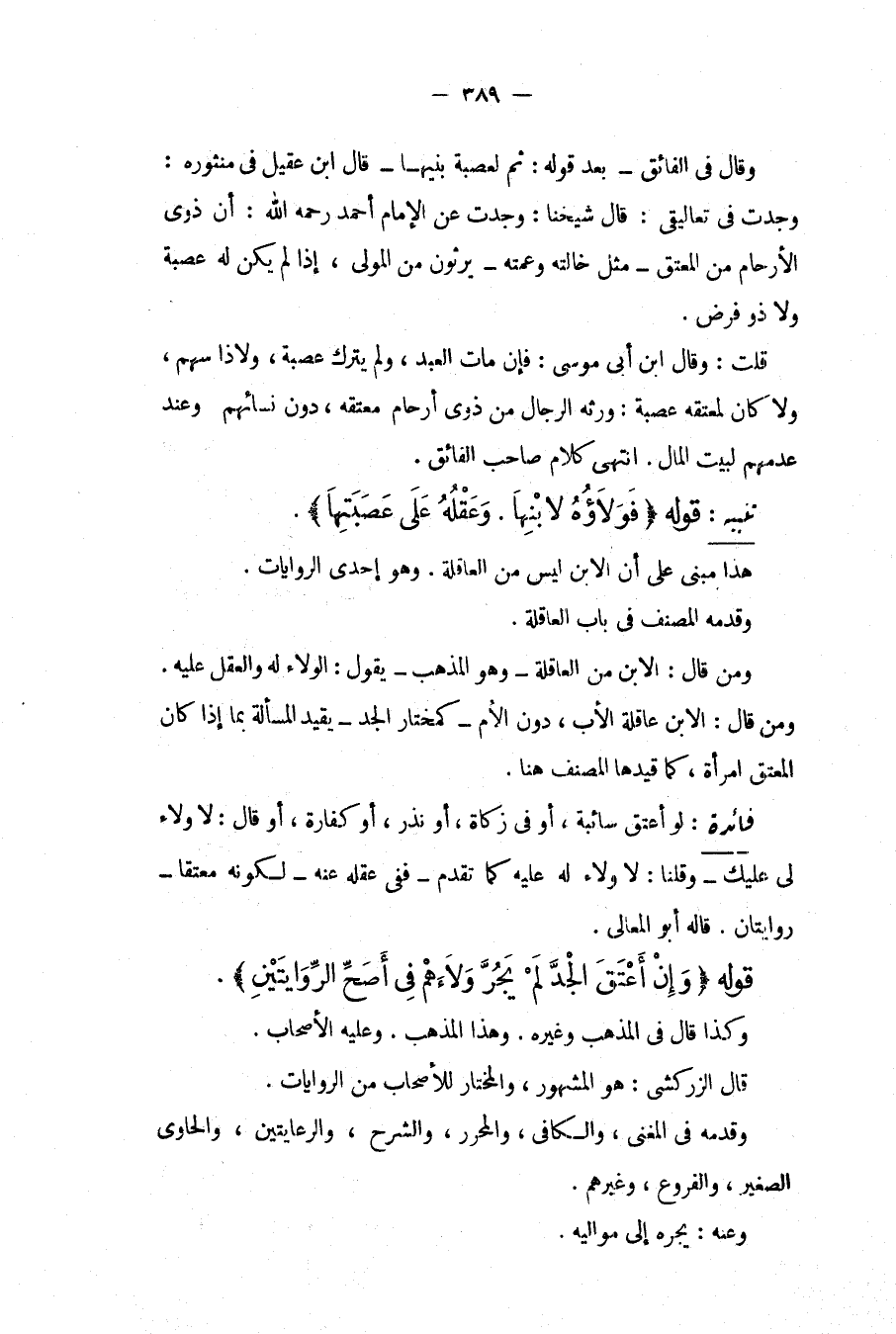 وَقَالَ فِي الْفَائِقِ بَعْدَ قَوْلِهِ: ثُمَّ لِعَصَبَةِ بَنِيهَا قَالَ ابْنُ عَقِيلٍ فِي مَنْثُورِهِ: وَجَدْت فِي تَعَالِيقِي: قَالَ شَيْخُنَا: وَجَدْت عَنْ الْإِمَامِ أَحْمَدَ - رَحِمَهُ اللَّهُ -: أَنَّ ذَوِي الْأَرْحَامِ مِنْ الْمُعْتِقِ مِثْلُ خَالَتِهِ وَعَمَّتِهِ يَرِثُونَ مِنْ الْمَوْلَى، إذَا لَمْ يَكُنْ لَهُ عَصَبَةٌ وَلَا ذُو فَرْضٍ. قُلْت: وَقَالَ ابْنُ أَبِي مُوسَى: فَإِنْ مَاتَ الْعَبْدُ، وَلَمْ يَتْرُكْ عَصَبَةً، وَلَا ذَا سَهْمٍ، وَلَا كَانَ لِمُعْتِقِهِ عَصَبَةٌ: وَرِثَهُ الرِّجَالُ مِنْ ذَوِي أَرْحَامِ مُعْتِقِهِ، دُونَ نِسَائِهِمْ وَعِنْدَ عَدَمِهِمْ لِبَيْتِ الْمَالِ. انْتَهَى كَلَامُ صَاحِبِ الْفَائِقِ.