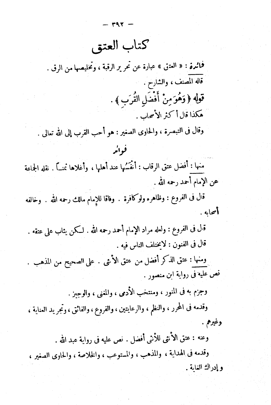 فَوَائِدُ: مِنْهَا: أَفْضَلُ عِتْقِ الرِّقَابِ: أَنْفَسُهَا عِنْدَ أَهْلِهَا، وَأَغْلَاهَا ثَمَنًا. نَقَلَهُ الْجَمَاعَةُ عَنْ الْإِمَامِ أَحْمَدَ - رَحِمَهُ اللَّهُ -. قَالَ فِي الْفُرُوعِ: وَظَاهِرُهُ وَلَوْ كَافِرَةً. وِفَاقًا لِلْإِمَامِ مَالِكٍ - رَحِمَهُ اللَّهُ -. وَخَالَفَهُ أَصْحَابُهُ. قَالَ فِي الْفُرُوعِ: وَلَعَلَّهُ مُرَادُ الْإِمَامِ أَحْمَدَ - رَحِمَهُ اللَّهُ - لَكِنْ يُثَابُ عَلَى عِتْقِهِ. قَالَ فِي الْفُنُونِ: لَا يَخْتَلِفُ النَّاسُ فِيهِ.
