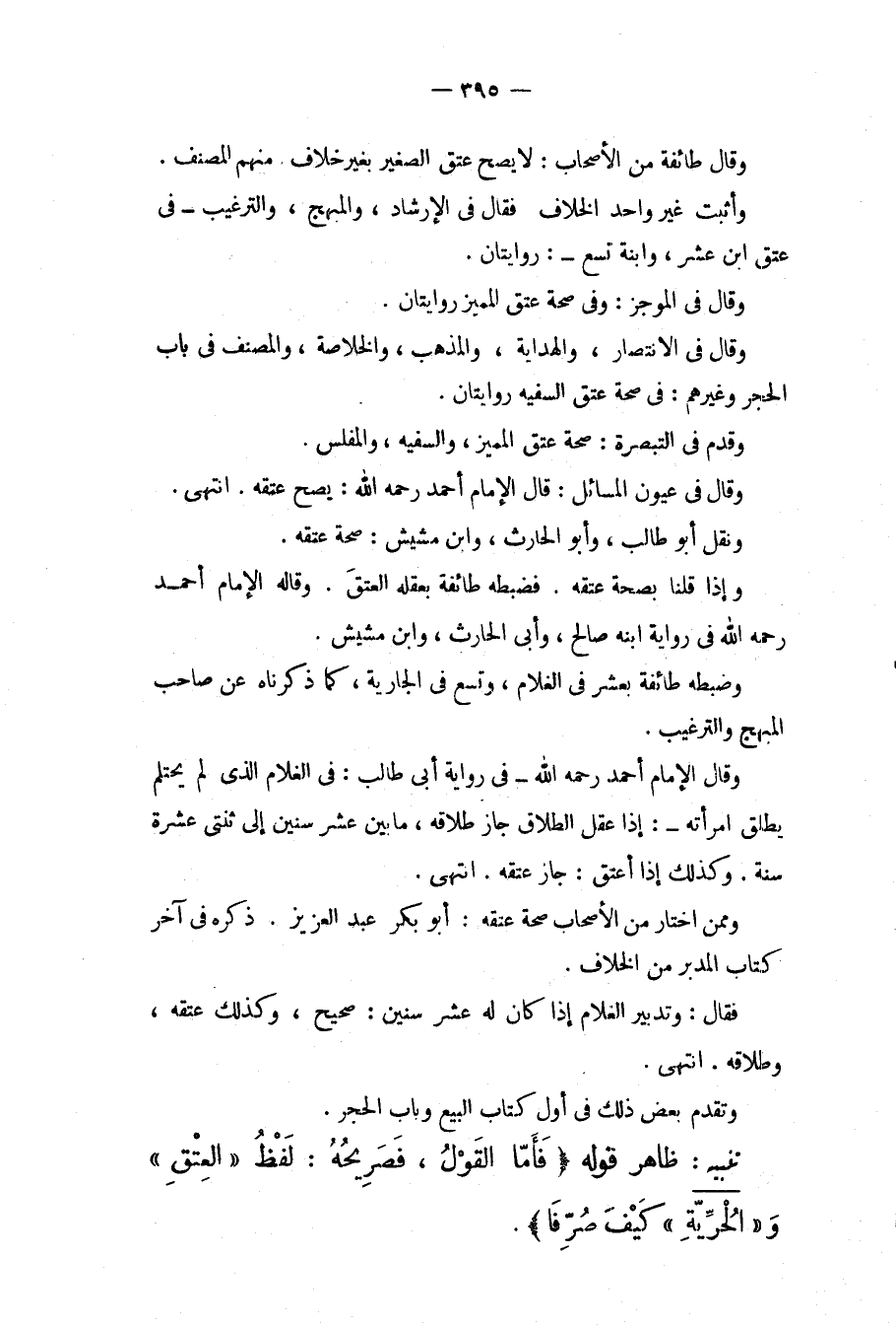 وَقَالَ طَائِفَةٌ مِنْ الْأَصْحَابِ: لَا يَصِحُّ عِتْقُ الصَّغِيرِ بِغَيْرِ خِلَافٍ. مِنْهُمْ الْمُصَنِّفُ. وَأَثْبَتَ غَيْرُ وَاحِدٍ الْخِلَافَ فَقَالَ فِي الْإِرْشَادِ، وَالْمُبْهِجِ، وَالتَّرْغِيبِ فِي عِتْقِ ابْنِ عَشْرٍ، وَابْنَةِ تِسْعٍ: رِوَايَتَانِ. وَقَالَ فِي الْمُوجَزِ: وَفِي صِحَّةِ عِتْقِ الْمُمَيِّزِ رِوَايَتَانِ. وَقَالَ فِي الِانْتِصَارِ، وَالْهِدَايَةِ، وَالْمُذْهَبِ، وَالْخُلَاصَةِ، وَالْمُصَنِّفِ فِي بَابِ الْحَجْرِ وَغَيْرِهِمْ: فِي صِحَّةِ عِتْقِ السَّفِيهِ رِوَايَتَانِ. وَقَدَّمَ فِي التَّبْصِرَةِ: صِحَّةَ عِتْقِ الْمُمَيِّزِ، وَالسَّفِيهِ، وَالْمُفْلِسِ. وَقَالَ فِي عُيُونِ الْمَسَائِلِ: قَالَ الْإِمَامُ أَحْمَدُ - رَحِمَهُ اللَّهُ - يَصِحُّ عِتْقُهُ. انْتَهَى. وَنَقَلَ أَبُو طَالِبٍ، وَأَبُو الْحَارِثِ، وَابْنُ مُشَيْشٍ: صِحَّةَ عِتْقِهِ. وَإِذَا قُلْنَا بِصِحَّةِ عِتْقِهِ. فَضَبَطَهُ طَائِفَةٌ بِعَقْلِهِ الْعِتْقَ. وَقَالَهُ الْإِمَامُ أَحْمَدُ - رَحِمَهُ اللَّهُ - فِي رِوَايَةِ ابْنِهِ صَالِحٍ، وَأَبِي الْحَارِثِ، وَابْنِ مُشَيْشٍ. وَضَبَطَهُ طَائِفَةٌ بِعَشْرٍ فِي الْغُلَامِ، وَتِسْعٍ فِي الْجَارِيَةِ، كَمَا ذَكَرْنَاهُ عَنْ صَاحِبِ الْمُبْهِجِ وَالتَّرْغِيبِ. وَقَالَ الْإِمَامُ أَحْمَدُ - رَحِمَهُ اللَّهُ - فِي رِوَايَةِ أَبِي طَالِبٍ: فِي الْغُلَامِ الَّذِي لَمْ يَحْتَلِمْ يُطَلِّقُ امْرَأَتَهُ: إذَا عَقَلَ الطَّلَاقَ جَازَ طَلَاقُهُ، مَا بَيْنَ عَشْرِ سِنِينَ إلَى ثِنْتَيْ عَشْرَةَ سَنَةً. وَكَذَلِكَ إذَا أَعْتَقَ: جَازَ عِتْقُهُ. انْتَهَى. وَمِمَّنْ اخْتَارَ مِنْ الْأَصْحَابِ صِحَّةَ عِتْقِهِ: أَبُو بَكْرٍ عَبْدُ الْعَزِيزِ. ذَكَرَهُ فِي آخِرِ كِتَابِ الْمُدَبَّرِ مِنْ الْخِلَافِ. فَقَالَ: وَتَدْبِيرُ الْغُلَامِ إذَا كَانَ لَهُ عَشْرُ سِنِينَ: صَحِيحٌ، وَكَذَلِكَ عِتْقُهُ، وَطَلَاقُهُ. انْتَهَى. وَتَقَدَّمَ بَعْضُ ذَلِكَ فِي أَوَّلِ كِتَابِ الْبَيْعِ وَبَابِ الْحَجْرِ.