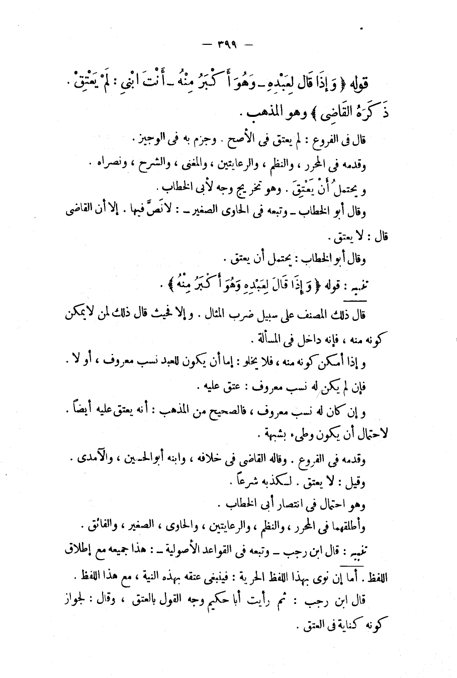 تَنْبِيهٌ: قَوْلُهُ (وَإِذَا قَالَ لِعَبْدِهِ وَهُوَ أَكْبَرُ مِنْهُ) قَالَ ذَلِكَ الْمُصَنِّفُ عَلَى سَبِيلِ ضَرْبِ الْمِثَالِ. وَإِلَّا فَحَيْثُ قَالَ ذَلِكَ لِمَنْ لَا يُمْكِنُ كَوْنُهُ مِنْهُ، فَإِنَّهُ دَاخِلٌ فِي الْمَسْأَلَةِ. وَإِذَا أَمْكَنَ كَوْنُهُ مِنْهُ، فَلَا يَخْلُو: إمَّا أَنْ يَكُونَ لِلْعَبْدِ نَسَبٌ مَعْرُوفٌ، أَوْ لَا. فَإِنْ لَمْ يَكُنْ لَهُ نَسَبٌ مَعْرُوفٌ: عَتَقَ عَلَيْهِ. وَإِنْ كَانَ لَهُ نَسَبٌ مَعْرُوفٌ، فَالصَّحِيحُ مِنْ الْمَذْهَبِ: أَنَّهُ يُعْتَقُ عَلَيْهِ أَيْضًا. لِاحْتِمَالِ أَنْ يَكُونَ وَطِئَ بِشُبْهَةٍ. وَقَدَّمَهُ فِي الْفُرُوعِ. وَقَالَهُ الْقَاضِي فِي خِلَافِهِ، وَابْنُهُ أَبُو الْحُسَيْنِ، وَالْآمِدِيُّ. وَقِيلَ: لَا يُعْتَقُ. لِكَذِبِهِ شَرْعًا. وَهُوَ احْتِمَالٌ فِي انْتِصَارِ أَبِي الْخَطَّابِ. وَأَطْلَقَهُمَا فِي الْمُحَرَّرِ، وَالنَّظْمِ، وَالرِّعَايَتَيْنِ، وَالْحَاوِي الصَّغِيرِ، وَالْفَائِقِ.