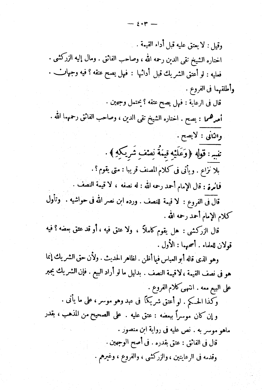 فَائِدَةٌ: قَالَ الْإِمَامُ أَحْمَدُ - رَحِمَهُ اللَّهُ -: لَهُ نِصْفُهُ، لَا قِيمَةُ النِّصْفِ. قَالَ فِي الْفُرُوعِ: لَا قِيمَةَ لِلنِّصْفِ. وَرَدَّهُ ابْنُ نَصْرِ اللَّهِ فِي حَوَاشِيهِ. وَتَأَوَّلَ كَلَامَ الْإِمَامِ أَحْمَدَ - رَحِمَهُ اللَّهُ -. قَالَ الزَّرْكَشِيُّ: هَلْ يُقَوَّمُ كَامِلًا، وَلَا عِتْقَ فِيهِ، أَوْ قَدْ عَتَقَ بَعْضُهُ؟ فِيهِ قَوْلَانِ لِلْعُلَمَاءِ. أَصَحُّهُمَا: الْأَوَّلُ. وَهُوَ الَّذِي قَالَهُ أَبُو الْعَبَّاسِ فِيمَا أَظُنُّ. لِظَاهِرِ الْحَدِيثِ. وَلِأَنَّ حَقَّ الشَّرِيكِ إنَّمَا هُوَ فِي نِصْفِ الْقِيمَةِ، لَا قِيمَةِ النِّصْفِ. بِدَلِيلِ مَا لَوْ أَرَادَ الْبَيْعَ. فَإِنَّ الشَّرِيكَ يُجْبَرُ عَلَى الْبَيْعِ مَعَهُ. انْتَهَى كَلَامُ الْفُرُوعِ. وَكَذَا الْحُكْمُ. لَوْ أَعْتَقَ شَرِيكًا فِي عَبْدٍ وَهُوَ مُوسِرٌ، عَلَى مَا يَأْتِي. وَإِنْ كَانَ مُوسِرًا بِبَعْضِهِ: عَتَقَ عَلَيْهِ. عَلَى الصَّحِيحِ مِنْ الْمَذْهَبِ، بِقَدْرِ مَا هُوَ مُوسِرٌ بِهِ. نَصَّ عَلَيْهِ فِي رِوَايَةِ ابْنِ مَنْصُورٍ. قَالَ فِي الْفَائِقِ: عَتَقَ بِقَدْرِهِ. فِي أَصَحِّ الْوَجْهَيْنِ. وَقَدَّمَهُ فِي الرِّعَايَتَيْنِ، وَالزَّرْكَشِيِّ، وَالْفُرُوعِ، وَغَيْرُهُمْ.