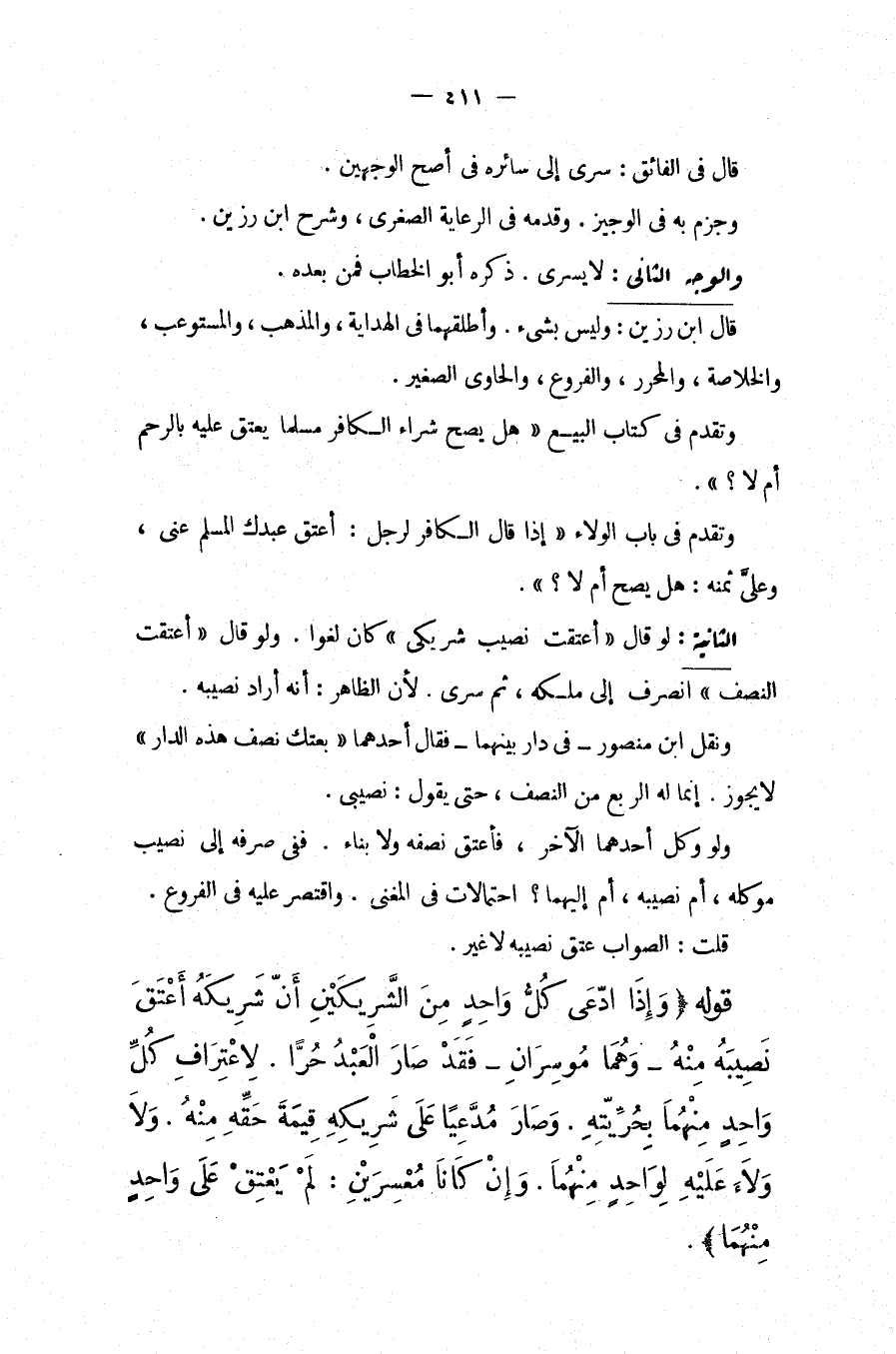 وَالْوَجْهُ الثَّانِي: لَا يَسْرِي. ذَكَرَهُ أَبُو الْخَطَّابِ فَمَنْ بَعْدَهُ. قَالَ ابْنُ رَزِينٍ: وَلَيْسَ بِشَيْءٍ. وَأَطْلَقَهُمَا فِي الْهِدَايَةِ، وَالْمُذْهَبِ، وَالْمُسْتَوْعِبِ، وَالْخُلَاصَةِ، وَالْمُحَرَّرِ، وَالْفُرُوعِ، وَالْحَاوِي الصَّغِيرِ. وَتَقَدَّمَ فِي كِتَابِ الْبَيْعِ " هَلْ يَصِحُّ شِرَاءُ الْكَافِرِ مُسْلِمًا يُعْتَقُ عَلَيْهِ بِالرَّحِمِ أَمْ لَا؟ ". وَتَقَدَّمَ فِي بَابِ الْوَلَاءِ " إذَا قَالَ الْكَافِرُ لِرَجُلٍ: أَعْتِقْ عَبْدَك الْمُسْلِمَ عَنِّي، وَعَلَيَّ ثَمَنُهُ: هَلْ يَصِحُّ أَمْ لَا؟ ".