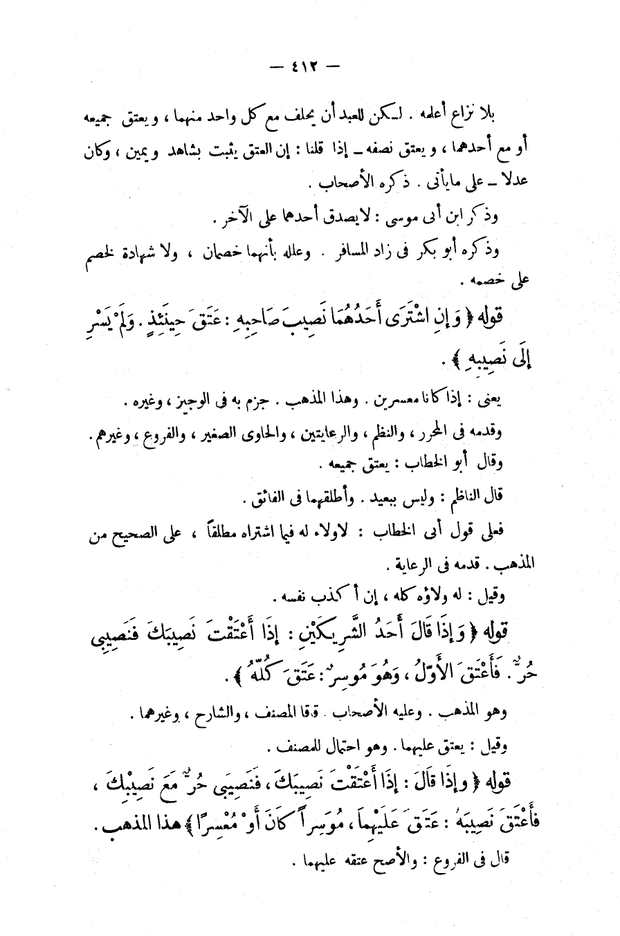 قَوْلُهُ (وَإِنْ اشْتَرَى أَحَدُهُمَا نَصِيبَ صَاحِبِهِ: عَتَقَ حِينَئِذٍ. وَلَمْ يَسْرِ إلَى نَصِيبِهِ) . يَعْنِي: إذَا كَانَا مُعْسِرَيْنِ. وَهَذَا الْمَذْهَبُ. جَزَمَ بِهِ فِي الْوَجِيزِ، وَغَيْرِهِ. وَقَدَّمَهُ فِي الْمُحَرَّرِ، وَالنَّظْمِ، وَالرِّعَايَتَيْنِ، وَالْحَاوِي الصَّغِيرِ، وَالْفُرُوعِ، وَغَيْرُهُمْ. وَقَالَ أَبُو الْخَطَّابِ: يُعْتَقُ جَمِيعُهُ. قَالَ النَّاظِمُ: وَلَيْسَ بِبَعِيدٍ. وَأَطْلَقَهُمَا فِي الْفَائِقِ. فَعَلَى قَوْلِ أَبِي الْخَطَّابِ: لَا وَلَاءَ لَهُ فِيمَا اشْتَرَاهُ مُطْلَقًا، عَلَى الصَّحِيحِ مِنْ الْمَذْهَبِ. قَدَّمَهُ فِي الرِّعَايَةِ وَقِيلَ: لَهُ وَلَاؤُهُ كُلُّهُ، إنْ أَكْذَبَ نَفْسَهُ.