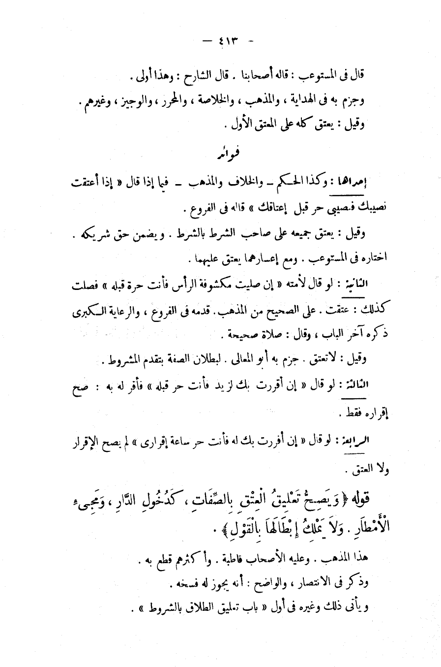 فَوَائِدُ: إحْدَاهَا: وَكَذَا الْحُكْمُ وَالْخِلَافُ وَالْمُذْهَبُ فِيمَا إذَا قَالَ " إذَا أَعْتَقْت نَصِيبَك فَنَصِيبِي حُرٌّ قَبْلَ إعْتَاقِك " قَالَهُ فِي الْفُرُوعِ. وَقِيلَ: يُعْتَقُ جَمِيعُهُ عَلَى صَاحِبِ الشَّرْطِ بِالشَّرْطِ. وَيَضْمَنُ حَقَّ شَرِيكِهِ. اخْتَارَهُ فِي الْمُسْتَوْعِبِ. وَمَعَ إعْسَارِهِمَا يُعْتَقُ عَلَيْهِمَا.