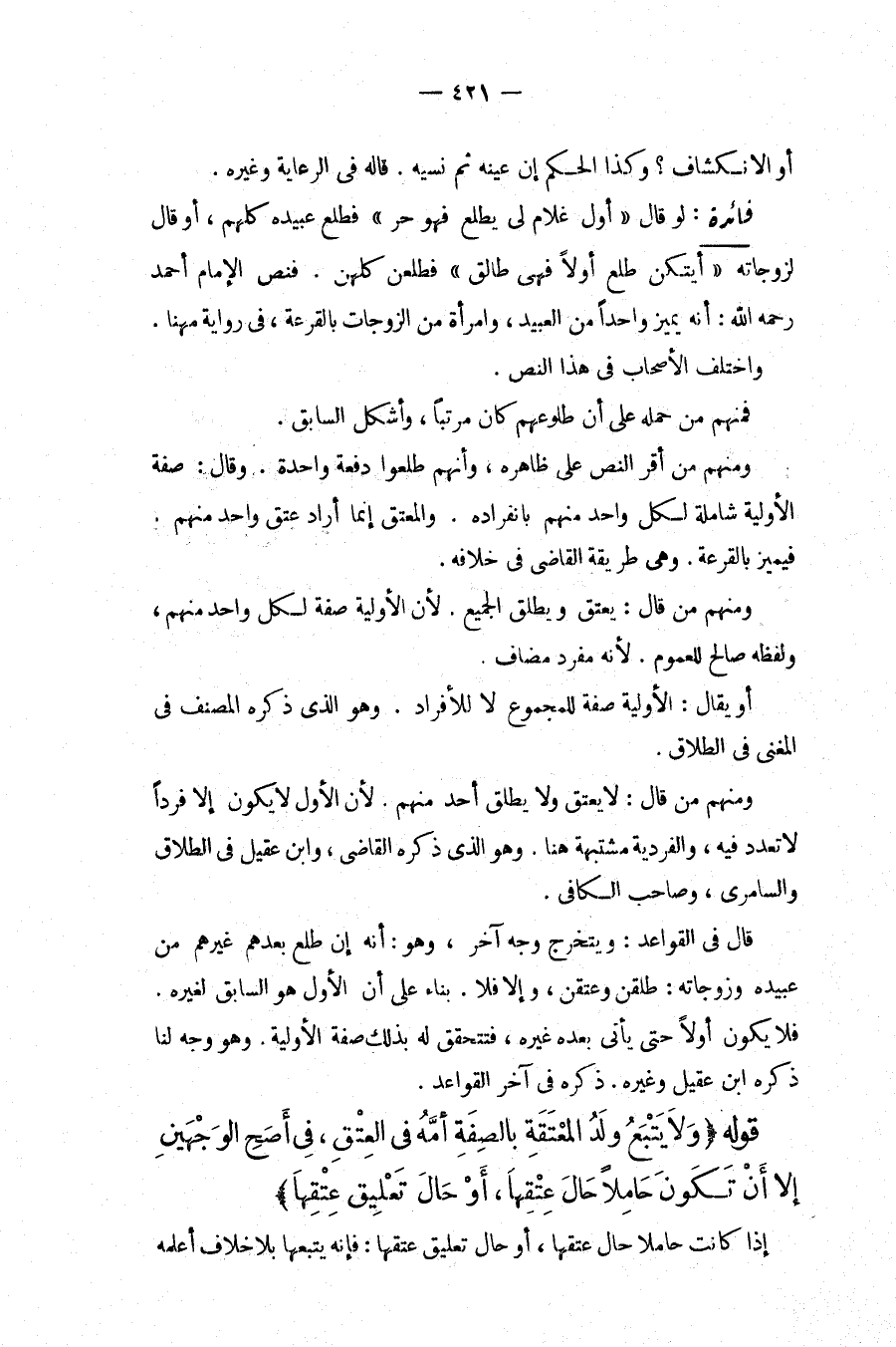 فَائِدَةٌ: لَوْ قَالَ " أَوَّلُ غُلَامٍ لِي يَطْلُعُ فَهُوَ حُرٌّ " فَطَلَعَ عَبِيدُهُ كُلُّهُمْ، أَوْ قَالَ لِزَوْجَاتِهِ " أَيَّتُكُنَّ طَلَعَ أَوَّلًا فَهِيَ طَالِقٌ " فَطَلَعْنَ كُلُّهُنَّ. فَنَصَّ الْإِمَامُ أَحْمَدُ - رَحِمَهُ اللَّهُ -: أَنَّهُ يُمَيِّزُ وَاحِدًا مِنْ الْعَبِيدِ، وَامْرَأَةً مِنْ الزَّوْجَاتِ بِالْقُرْعَةِ، فِي رِوَايَةِ مُهَنَّا. وَاخْتَلَفَ الْأَصْحَابُ فِي هَذَا النَّصِّ. فَمِنْهُمْ مَنْ حَمَلَهُ عَلَى أَنَّ طُلُوعَهُمْ كَانَ مُرَتَّبًا، وَأُشْكِلَ السَّابِقُ. وَمِنْهُمْ مَنْ أَقَرَّ النَّصَّ عَلَى ظَاهِرِهِ، وَأَنَّهُمْ طَلَعُوا دَفْعَةً وَاحِدَةً. وَقَالَ: صِفَةُ الْأَوَّلِيَّةِ شَامِلَةٌ لِكُلِّ وَاحِدٍ مِنْهُمْ بِانْفِرَادِهِ. وَالْمُعْتِقُ إنَّمَا أَرَادَ عِتْقَ وَاحِدٍ مِنْهُمْ. فَيُمَيَّزُ بِالْقُرْعَةِ. وَهِيَ طَرِيقَةُ الْقَاضِي فِي خِلَافِهِ. وَمِنْهُمْ مَنْ قَالَ: يُعْتَقُ وَيُطَلِّقُ الْجَمِيعَ لِأَنَّ الْأَوَّلِيَّةَ صِفَةٌ لِكُلِّ وَاحِدٍ مِنْهُمْ، وَلَفْظُهُ صَالِحٌ لِلْعُمُومِ. لِأَنَّهُ مُفْرَدٌ مُضَافٌ. أَوْ يُقَالُ: الْأَوَّلِيَّةُ صِفَةٌ لِلْمَجْمُوعِ لَا لِلْأَفْرَادِ. وَهُوَ الَّذِي ذَكَرَهُ الْمُصَنِّفُ فِي الْمُغْنِي فِي الطَّلَاقِ. وَمِنْهُمْ مَنْ قَالَ: لَا يُعْتِقُ وَلَا يُطَلِّقُ أَحَدٌ مِنْهُمْ. لِأَنَّ الْأَوَّلَ لَا يَكُونُ إلَّا فَرْدًا لَا تَعَدُّدَ فِيهِ، وَالْفَرْدِيَّةُ مُشْتَبِهَةٌ هُنَا. وَهُوَ الَّذِي ذَكَرَهُ الْقَاضِي، وَابْنُ عَقِيلٍ فِي الطَّلَاقِ وَالسَّامِرِيُّ، وَصَاحِبُ الْكَافِي. قَالَ فِي الْقَوَاعِدِ: وَيَتَخَرَّجُ وَجْهٌ آخَرُ، وَهُوَ: أَنَّهُ إنْ طَلَعَ بَعْدَهُمْ غَيْرُهُمْ مِنْ عَبِيدِهِ وَزَوْجَاتِهِ: طُلِّقْنَ وَعَتَقْنَ، وَإِلَّا فَلَا. بِنَاءً عَلَى أَنَّ الْأَوَّلَ هُوَ السَّابِقُ لِغَيْرِهِ. فَلَا يَكُونُ أَوَّلًا حَتَّى يَأْتِيَ بَعْدَهُ غَيْرُهُ، فَتَتَحَقَّقُ لَهُ بِذَلِكَ صِفَةُ الْأَوَّلِيَّةِ. وَهُوَ وَجْهٌ لَنَا ذَكَرَهُ ابْنُ عَقِيلٍ وَغَيْرُهُ. ذَكَرَهُ فِي آخِرِ الْقَوَاعِدِ.
