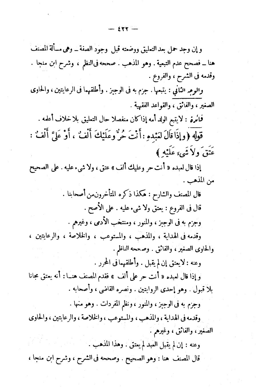 قَوْلُهُ (وَإِذَا قَالَ لِعَبْدِهِ: أَنْتَ حُرٌّ وَعَلَيْك أَلْفٌ، أَوْ عَلَيَّ أَلْفٌ: عَتَقَ وَلَا شَيْءَ عَلَيْهِ) إذَا قَالَ لِعَبْدِهِ " أَنْتَ حُرٌّ وَعَلَيْك أَلْفٌ "، وَلَا شَيْءَ عَلَيْهِ. عَلَى الصَّحِيحِ مِنْ الْمَذْهَبِ. قَالَ الْمُصَنِّفُ وَالشَّارِحُ: هَكَذَا ذَكَرَهُ الْمُتَأَخِّرُونَ مِنْ أَصْحَابِنَا. قَالَ فِي الْفُرُوعِ: يُعْتَقُ وَلَا شَيْءَ عَلَيْهِ. عَلَى الْأَصَحِّ. وَجَزَمَ بِهِ فِي الْوَجِيزِ، وَالْمُنَوِّرِ، وَمُنْتَخَبِ الْأَدَمِيِّ، وَغَيْرُهُمْ. وَقَدَّمَهُ فِي الْهِدَايَةِ، وَالْمُذْهَبِ، وَالْمُسْتَوْعِبِ، وَالْخُلَاصَةِ، وَالرِّعَايَتَيْنِ، وَالْحَاوِي الصَّغِيرِ، وَالْفَائِقِ. وَصَحَّحَهُ النَّاظِمُ. وَعَنْهُ: لَا يُعْتَقُ إنْ لَمْ يَقْبَلْ. وَأَطْلَقَهُمَا فِي الْمُحَرَّرِ. وَإِذَا قَالَ لِعَبْدِهِ " أَنْتَ حُرٌّ عَلَى أَلْفٍ " فَقَدَّمَ الْمُصَنِّفُ هُنَا: أَنَّهُ يُعْتَقُ مَجَّانًا بِلَا قَبُولٍ. وَهُوَ إحْدَى الرِّوَايَتَيْنِ. وَنَصَرَهُ الْقَاضِي، وَأَصْحَابُهُ. وَجَزَمَ بِهِ فِي الْوَجِيزِ، وَالْمُنَوِّرِ، وَنَظْمِ الْمُفْرَدَاتِ. وَهُوَ مِنْهَا. وَقَدَّمَهُ فِي الْهِدَايَةِ، وَالْمُذْهَبِ، وَالْمُسْتَوْعِبِ، وَالْخُلَاصَةِ، وَالرِّعَايَتَيْنِ، وَالْحَاوِي الصَّغِيرِ، وَالْفَائِقِ، وَغَيْرُهُمْ. وَعَنْهُ: إنْ لَمْ يَقْبَلْ الْعَبْدُ لَمْ يُعْتَقْ. وَهَذَا الْمَذْهَبُ. قَالَ الْمُصَنِّفُ هُنَا: وَهُوَ الصَّحِيحُ. وَصَحَّحَهُ فِي الشَّرْحِ، وَشَرْحِ ابْنِ مُنَجَّا.