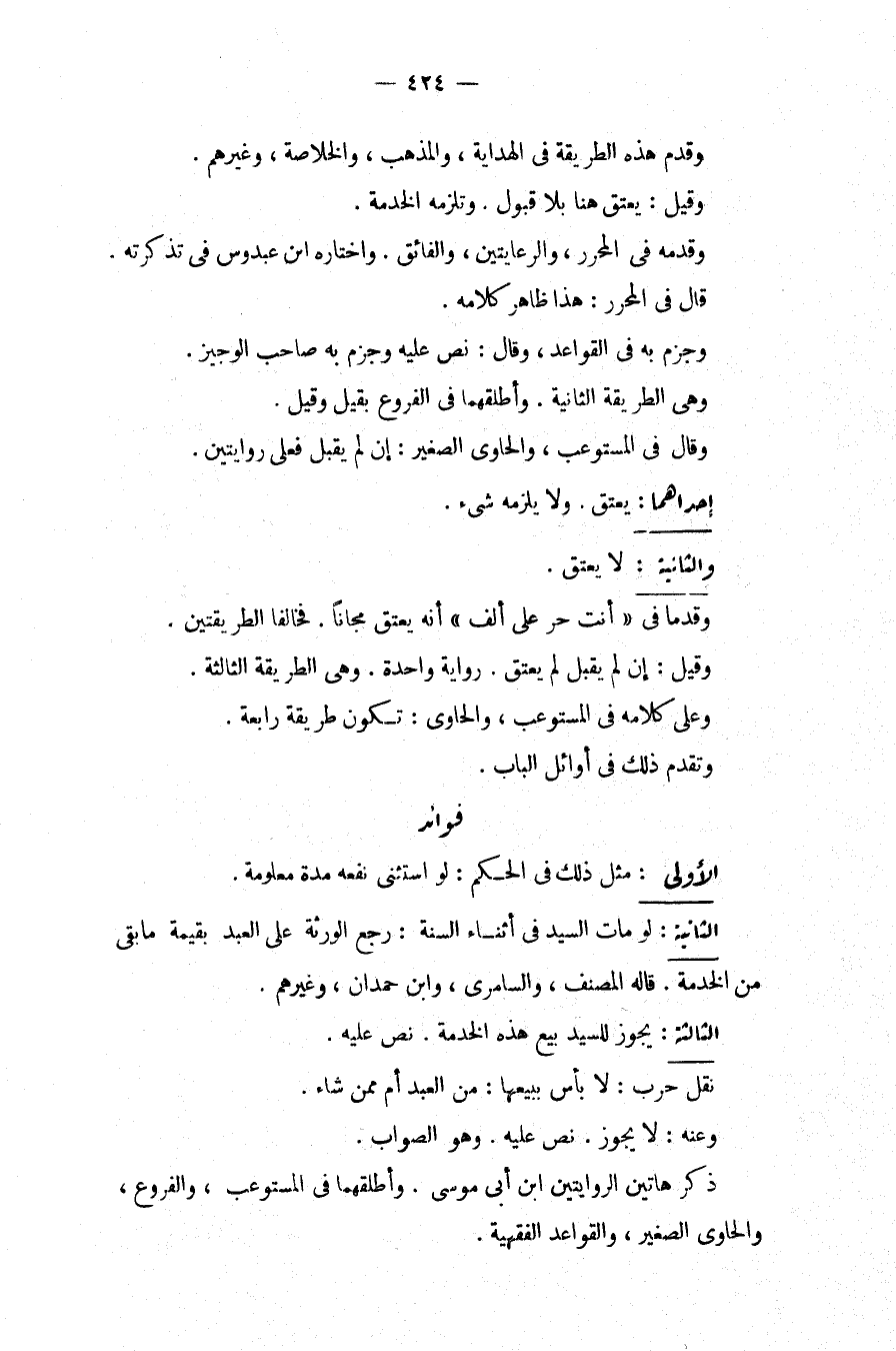 وَقَدَّمَ هَذِهِ الطَّرِيقَةَ فِي الْهِدَايَةِ، وَالْمُذْهَبِ، وَالْخُلَاصَةِ، وَغَيْرُهُمْ. وَقِيلَ: يُعْتَقُ هُنَا بِلَا قَبُولٍ. وَتَلْزَمُهُ الْخِدْمَةُ. وَقَدَّمَهُ فِي الْمُحَرَّرِ، وَالرِّعَايَتَيْنِ، وَالْفَائِقِ. اخْتَارَهُ ابْنُ عَبْدُوسٍ فِي تَذْكِرَتِهِ. قَالَ فِي الْمُحَرَّرِ: هَذَا ظَاهِرُ كَلَامِهِ. وَجَزَمَ بِهِ فِي الْقَوَاعِدِ، وَقَالَ: نَصَّ عَلَيْهِ وَجَزَمَ بِهِ صَاحِبُ الْوَجِيزِ. وَهِيَ الطَّرِيقَةُ الثَّانِيَةُ. وَأَطْلَقَهُمَا فِي الْفُرُوعِ بِقِيلَ وَقِيلَ. وَقَالَ فِي الْمُسْتَوْعِبِ، وَالْحَاوِي الصَّغِيرِ: إنْ لَمْ يَقْبَلْ فَعَلَى رِوَايَتَيْنِ.