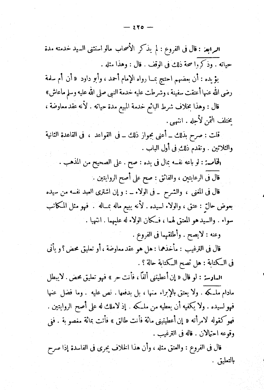 الرَّابِعَةُ: قَالَ فِي الْفُرُوعِ: لَمْ يَذْكُرْ الْأَصْحَابُ مَا لَوْ اسْتَثْنَى السَّيِّدُ خِدْمَتَهُ مُدَّةَ حَيَاتِهِ. وَذَكَرُوا صِحَّةَ ذَلِكَ فِي الْوَقْفِ. قَالَ: وَهَذَا مِثْلُهُ. يُؤَيِّدُهُ: أَنَّ بَعْضَهُمْ احْتَجَّ بِمَا رَوَاهُ الْإِمَامُ أَحْمَدُ، وَأَبُو دَاوُد " أَنَّ أُمَّ سَلَمَةَ - رَضِيَ اللَّهُ عَنْهَا - أَعْتَقَتْ سَفِينَةَ، وَشَرَطَتْ عَلَيْهِ خِدْمَةَ النَّبِيِّ - صَلَّى اللَّهُ عَلَيْهِ وَسَلَّمَ - مَا عَاشَ " قَالَ: وَهَذَا بِخِلَافِ شَرْطِ الْبَائِعِ خِدْمَةَ الْمَبِيعِ مُدَّةَ حَيَاتِهِ. لِأَنَّهُ عَقْدُ مُعَاوَضَةٍ، يَخْتَلِفُ الثَّمَنُ لِأَجْلِهِ. انْتَهَى. قُلْت: صَرَّحَ بِذَلِكَ أَعْنِي بِجَوَازِ ذَلِكَ فِي الْقَوَاعِدِ، فِي الْقَاعِدَةِ الثَّانِيَةِ وَالثَّلَاثِينَ. وَتَقَدَّمَ ذَلِكَ فِي أَوَّلِ الْبَابِ.