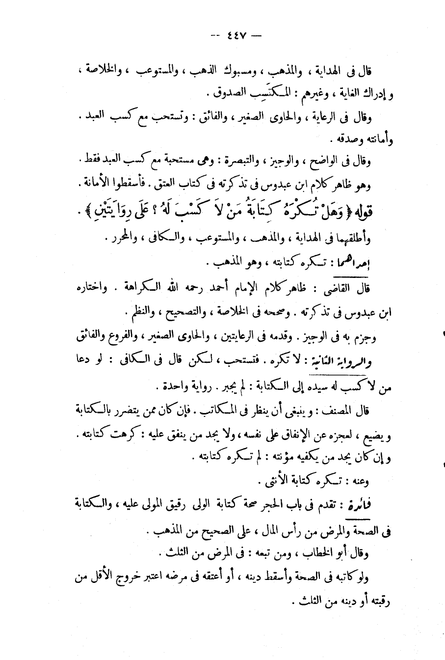 إحْدَاهُمَا: تُكْرَهُ كِتَابَتُهُ، وَهُوَ الْمَذْهَبُ. قَالَ الْقَاضِي: ظَاهِرُ كَلَامِ الْإِمَامِ أَحْمَدَ - رَحِمَهُ اللَّهُ - الْكَرَاهَةُ. وَاخْتَارَهُ ابْنُ عَبْدُوسٍ فِي تَذْكِرَتِهِ. وَصَحَّحَهُ فِي الْخُلَاصَةِ، وَالصَّحِيحِ، وَالنَّظْمِ. وَجَزَمَ بِهِ فِي الْوَجِيزِ. وَقَدَّمَهُ فِي الرِّعَايَتَيْنِ، وَالْحَاوِي الصَّغِيرِ، وَالْفُرُوعِ وَالْفَائِقِ