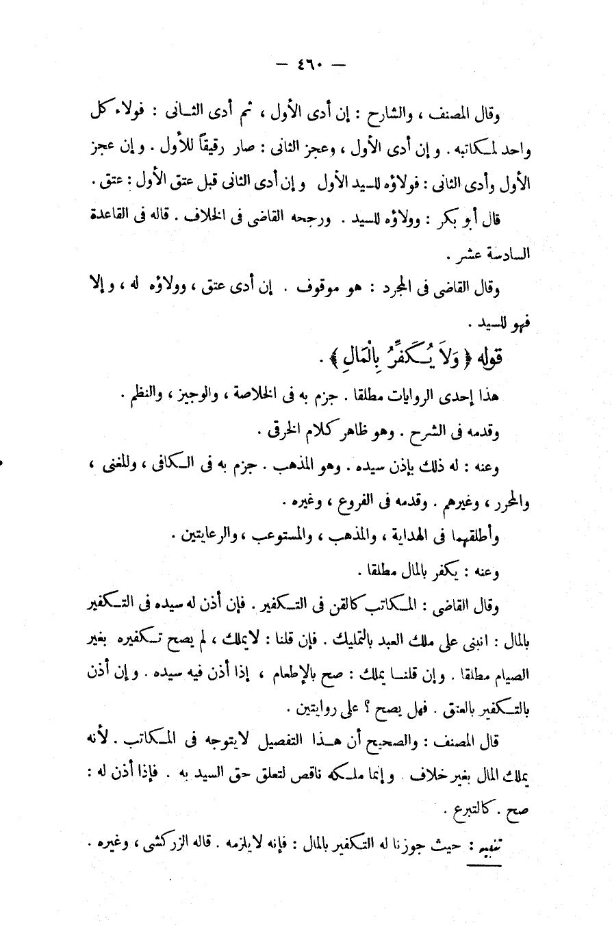 قَوْلُهُ (وَلَا يُكَفِّرُ بِالْمَالِ) . هَذَا إحْدَى الرِّوَايَاتِ مُطْلَقًا. جَزَمَ بِهِ فِي الْخُلَاصَةِ، وَالْوَجِيزِ، وَالنَّظْمِ. وَقَدَّمَهُ فِي الشَّرْحِ. وَهُوَ ظَاهِرُ كَلَامِ الْخِرَقِيِّ. وَعَنْهُ: لَهُ ذَلِكَ بِإِذْنِ سَيِّدِهِ. وَهُوَ الْمَذْهَبُ. جَزَمَ بِهِ فِي الْكَافِي، وَالْمُغْنِي، وَالْمُحَرَّرِ، وَغَيْرِهِمْ. وَقَدَّمَهُ فِي الْفُرُوعِ، وَغَيْرِهِ. وَأَطْلَقَهُمَا فِي الْهِدَايَةِ، وَالْمُذْهَبِ، وَالْمُسْتَوْعِبِ، وَالرِّعَايَتَيْنِ. وَعَنْهُ: يُكَفِّرُ بِالْمَالِ مُطْلَقًا. وَقَالَ الْقَاضِي: الْمُكَاتَبُ كَالْقِنِّ فِي التَّكْفِيرِ. فَإِنْ أَذِنَ لَهُ سَيِّدُهُ فِي التَّكْفِيرِ بِالْمَالِ: انْبَنَى عَلَى مِلْكِ الْعَبْدِ بِالتَّمْلِيكِ. فَإِنْ قُلْنَا: لَا يَمْلِكُ، لَهُ يَصِحُّ تَكْفِيرُهُ بِغَيْرِ الصِّيَامِ مُطْلَقًا. وَإِنْ قُلْنَا يَمْلِكُ: صَحَّ بِالْإِطْعَامِ، إذَا أَذِنَ فِيهِ سَيِّدُهُ. وَإِنْ أَذِنَ بِالتَّكْفِيرِ بِالْعِتْقِ. فَهَلْ يَصِحُّ؟ عَلَى رِوَايَتَيْنِ. قَالَ الْمُصَنِّفُ: وَالصَّحِيحُ أَنَّ هَذَا التَّفْصِيلَ لَا يَتَوَجَّهُ فِي الْمُكَاتَبِ. لِأَنَّهُ يَمْلِكُ الْمَالَ بِغَيْرِ خِلَافٍ وَإِنَّمَا مِلْكُهُ نَاقِصٌ لِتَعَلُّقِ حَقِّ السَّيِّدِ بِهِ. فَإِذَا أَذِنَ لَهُ: صَحَّ. كَالتَّبَرُّعِ.
