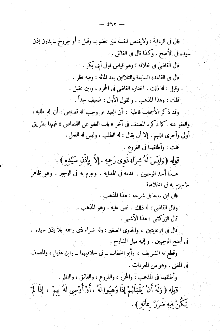 قَالَ فِي الرِّعَايَةِ: وَلَا يَقْتَصُّ لِنَفْسِهِ مِنْ عُضْوٍ وَقِيلَ: أَوْ جُرُوحٍ بِدُونِ إذْنِ سَيِّدِهِ فِي الْأَصَحِّ. وَكَذَا قَالَ فِي الْفَائِقِ. قَالَ الْقَاضِي فِي خِلَافِهِ: وَهُوَ قِيَاسُ قَوْلِ أَبِي بَكْرٍ. قَالَ فِي الْقَاعِدَةِ السَّابِعَةِ وَالثَّلَاثِينَ بَعْدَ الْمِائَةِ: وَفِيهِ نَظَرٌ. وَقِيلَ: لَهُ ذَلِكَ. اخْتَارَهُ الْقَاضِي فِي الْمُجَرَّدِ، وَابْنُ عَقِيلٍ. قُلْت: وَهَذَا الْمَذْهَبُ. وَالْقَوْلُ الْأَوَّلُ: ضَعِيفٌ جِدًّا. وَقَدْ ذَكَرَ الْأَصْحَابُ قَاطِبَةً: أَنَّ الْعَبْدَ لَوْ وَجَبَ لَهُ قِصَاصٌ: أَنَّ لَهُ طَلَبَهُ، وَالْعَفْوَ عَنْهُ. كَمَا ذَكَرَهُ الْمُصَنِّفُ فِي آخِرِ " بَابِ الْعَفْوِ عَنْ الْقِصَاصِ " فَهَاهُنَا بِطَرِيقٍ أَوْلَى وَأَحْرَى اللَّهُمَّ. إلَّا أَنْ يُقَالَ: لَهُ الطَّلَبُ، وَلَيْسَ لَهُ الْفِعْلُ. قُلْت: وَأَطْلَقَهُمَا فِي الْفُرُوعِ.