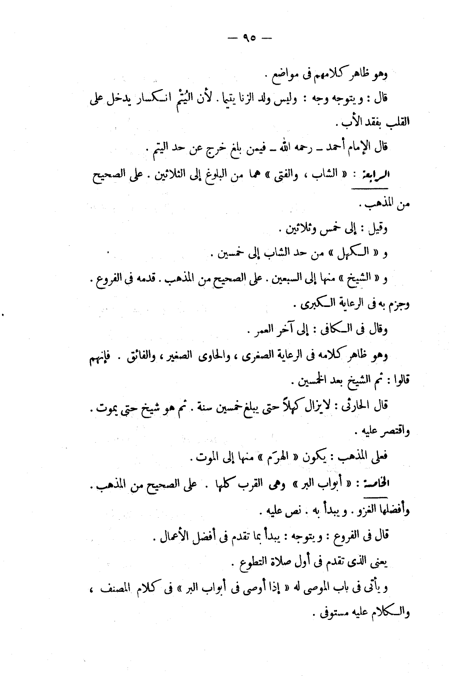 الرَّابِعَةُ: " الشَّابُّ، وَالْفَتَى " هُمَا مِنْ الْبُلُوغِ إلَى الثَّلَاثِينَ. عَلَى الصَّحِيحِ مِنْ الْمَذْهَبِ. وَقِيلَ: إلَى خَمْسٍ وَثَلَاثِينَ. وَ " الْكَهْلُ " مِنْ حَدِّ الشَّابِّ إلَى خَمْسِينَ. وَ " الشَّيْخُ " مِنْهَا إلَى السَّبْعِينَ. عَلَى الصَّحِيحِ مِنْ الْمَذْهَبِ. قَدَّمَهُ فِي الْفُرُوعِ. وَجَزَمَ بِهِ فِي الرِّعَايَةِ الْكُبْرَى. وَقَالَ فِي الْكَافِي: إلَى آخِرِ الْعُمُرِ. وَهُوَ ظَاهِرُ كَلَامِهِ فِي الرِّعَايَةِ الصُّغْرَى، وَالْحَاوِي الصَّغِيرِ، وَالْفَائِقِ. فَإِنَّهُمْ قَالُوا: ثُمَّ الشَّيْخُ بَعْدَ الْخَمْسِينَ. قَالَ الْحَارِثِيُّ: لَا يَزَالُ كَهْلًا حَتَّى يَبْلُغَ خَمْسِينَ سَنَةً. ثُمَّ هُوَ شَيْخٌ حَتَّى يَمُوتَ. وَاقْتَصَرَ عَلَيْهِ. فَعَلَى الْمَذْهَبِ: يَكُونُ " الْهَرَمُ " مِنْهَا إلَى الْمَوْتِ.