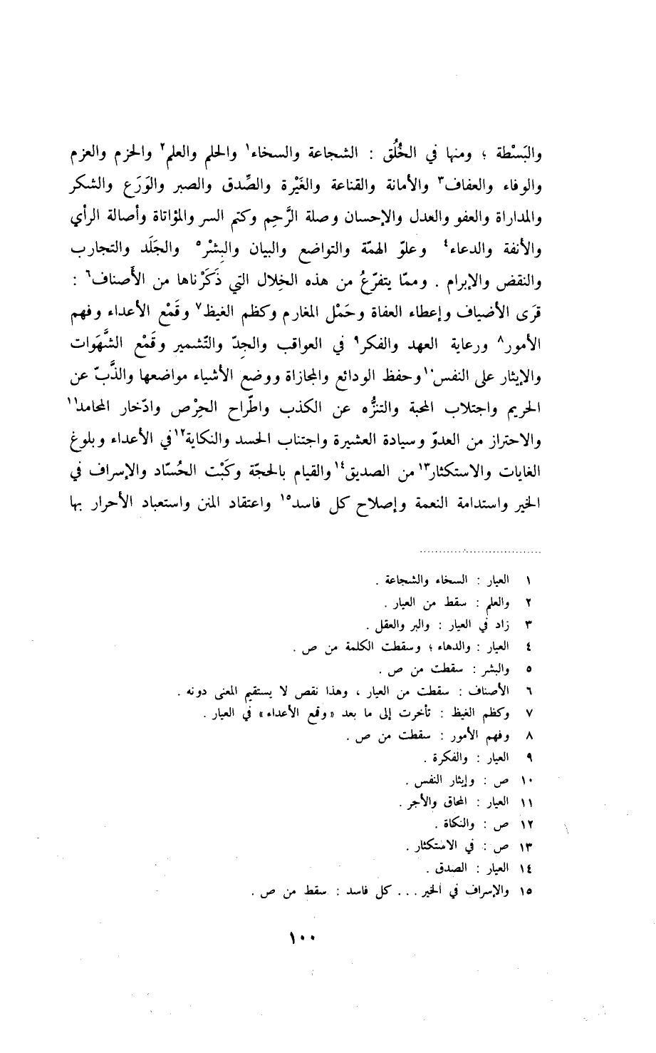 والبسطة؛ ومنها في الخلق: الشجاعة والسخاء والحلم والعلم والحزم والعزم والوفاء والعفاف والأمانة والقناعة والغيرة والصّدق والصبر والورع والشكر والمداراة والعفو والعدل والإحسان وصلة الرّحم وكتم السر والمؤاتاة وأصالة الرأي والأنفة والدعاء وعلوّ الهمّة والتواضع والبيان والبشر والجلد والتجارب والنقض والإبرام. وممّا يتفرّع من هذه الخلال التي ذكرناها من الأصناف: قرى الأضياف وإعطاء العفاة وحمل المغارم وكظم الغيظ وقمع الأعداء وفهم الأمور ورعاية العهد والفكر في العواقب والجد والتشمير وقمع الشّهوات والإيثار على النفس وحفظ الودائع والمجازاة ووضع الأشياء مواضعها والذّب عن الحريم واجتلاب المحبة والتنزّه عن الكذب واطّراح الحرص وادّخار المحامد والاحتراز من العدوّ وسيادة العشيرة واجتناب الحسد والنكاية في الأعداء وبلوغ الغايات والاستكثار من الصديق والقيام بالحجّة وكبت الحسّاد والإسراف في الخير واستدامة النعمة وإصلاح كل فاسد واعتقاد المنن واستعباد الأحرار بها
