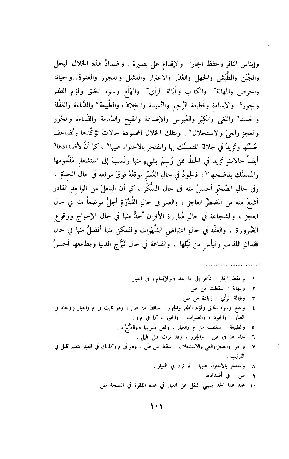 وإيناس النافر وحفظ الجار والإقدام على بصيرة. وأضداد هذه الخلال البخل والجبن والطّيش والجهل والغدر والاغترار والفشل والفجور والعقوق والخيانة والحرص والمهانة والكذب وفيالة الرأي والهلع وسوء الخلق ولؤم الظفر والجور والإساءة وقطيعة الرّحم والنّميمة والخلاف والطّبيعة والدّناءة والغفلة والحسد والبغي والكبر والعبوس والإضاعة والقبح والدّمامة والقماءة والخور والعجز والعيّ والاستحلال. ولتلك الخلال المحمودة حالاتٌ تؤكدها وتضاعف حسنها وتزيد في جلالة المتمسّك بها والمفتخر بالاحتواء عليها، كما أنّ لأضدادها أيضاً حالات تزيد في الحطّ ممن وسم بشيءٍ منها ونسب إلى استشعار مذمومها والتّمسك بفاضحها: فالجود في حال العسر موقعه فوق موقعه في حال الجدة وفي حال الصحو أحسن منه في حال السّكر، كما أن البخل من الواجد القادر أشنع منه من المضطّر العاجز، والعفو في حال القدرة أجلّ موضعاً منه في حال العجز، والشجاعة في حال مبارزة الأقران أحدّ منها في حال الإحواج ووقوع الضّرورة، والعفّة في حال اعتراض الشّهوات والتّمكن منها أفضل منها في حال فقدان اللذات واليأس من نيلها، والقناعة في حال تبرّج الدنيا ومطامعها أحسن