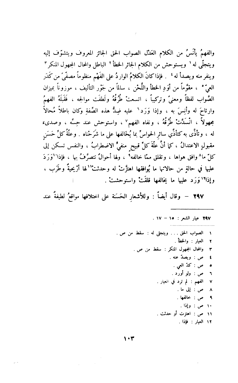 والفهم يأنس من الكلام العدل الصواب الحق الجائز المعروف ويتشوّف إليه ويتجلّى له ويستوحش من الكلام الجائر الخطأ الباطل والمحال المجهول المنكر وينفر منه ويصدأ له. فإذا كان الكلام الوارد على الفهم منظوماً مصفّىً من كدر العيّ، مقوّماً من أود الخطأ واللّحن، سالماً من جور التأليف، موزوناً بميزان الصّواب لفظاً ومعنىً وتركيباً، اتسعت طرقه ولطفت موالجه، فقبله الفهم وارتاح له وأنس به، وإذا ورد عليه ضدّ هذه الصّفة وكان باطلاً محالاً مجهولاً، انسدّت طرقه، ونفاه الفهم، واستوحش عند حسّه، وصدئ له، وتأذّى به كتأذّي سائر الحواسّ بما يخالفها على ما شرحناه. وعلّة كلّ حسن مقبولٍ الاعتدال، كما أنّ علّة كلّ قبيح منفيّ الاضطراب، والنفس تسكن إلى كلّ ما وافق هواها، وتقلق ممّا خالفه، ولها أحوالٌ تتصرّف بها، فإذا ورد عليها في حالةٍ من حالاتها ما يوافقها اهتزّت له وحدثت لها أريحية وطرب وإذا ورد عليها ما يخالفها قلقت واستوحشت.