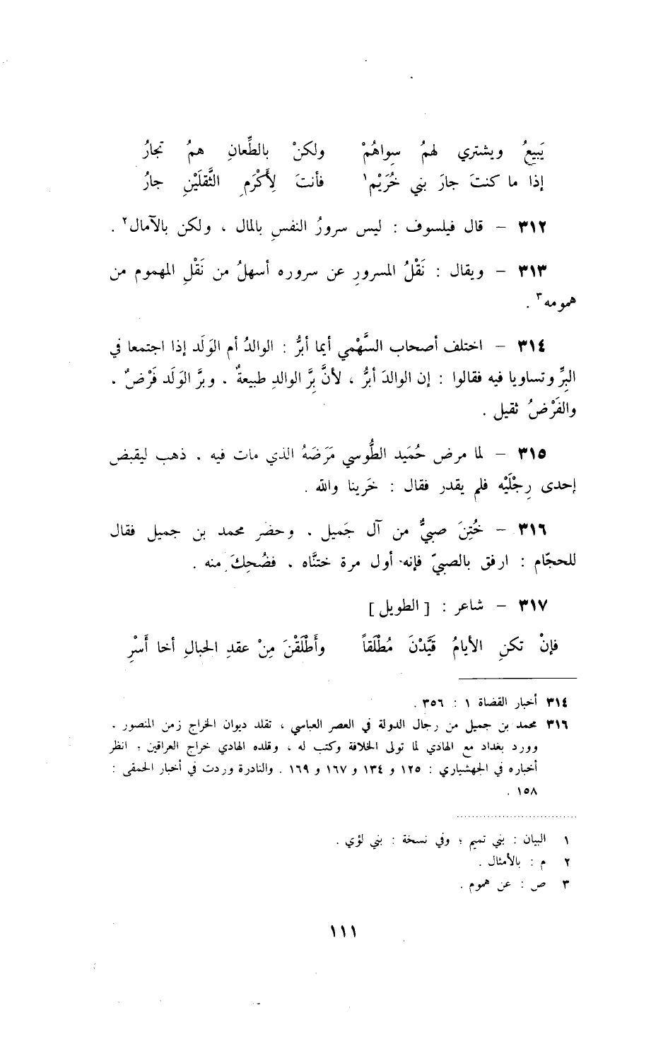 ختن صبيّ من آل جميل، وحضر محمد بن جميل فقال للحجّام: ارفق بالصبيّ فإنه أول مرة ختنّاه، فضحك منه.