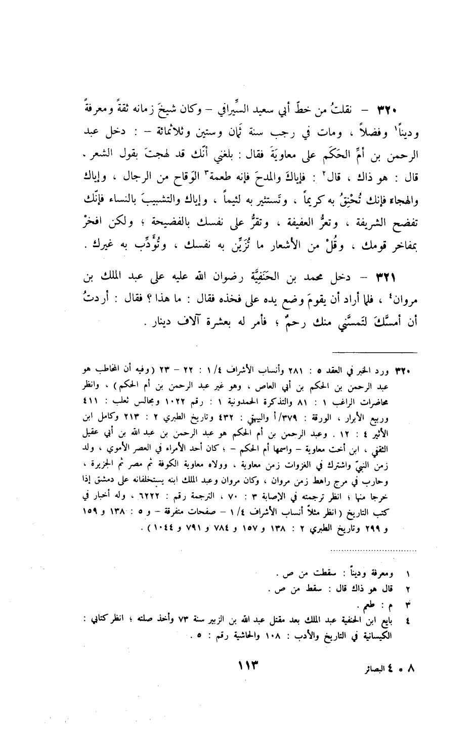 نقلت من خطّ أبي سعيد السيّرافي - وكان شيخ زمانه ثقةً ومعرفةً وديناً وفضلاً، ومات في رجب سنة ثمان وستين وثلاثمائة -: دخل عبد الرحمن بن أمّ الحكم على معاوية فقال: بلغني أنّك قد لهجت بقول الشعر، قال: هو ذاك، قال: فإياك والمدح فإنه طعمة الوقاح من الرجال، وإياك والهجاء فإنك تحنق به كريماً، وتستثير به لئيماً، وإياك والتشبيب بالنساء فإنّك تفضح الشريفة، وتعرّ العفيفة، وتقّر على نفسك بالفضيحة؛ ولكن افخر بمفاخر قومك، وقل من الأشعار ما تزيّن به نفسك، وتؤدّب به غيرك.