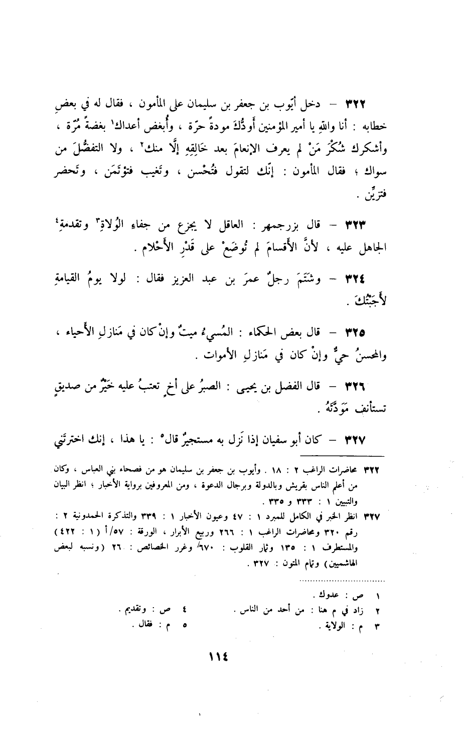 وشتم رجلٌ عمر بن عبد العزيز فقال: لولا يوم القيامة لأجبتك. فقال الحكماء: المسيء ميت وإن كان في منازل الأحياء والمحسن حي وإن كان في منازل الأموات قال الفضل بن يحيى: الصبر على أخٍ تعتب عليه خيرٌ من صديقٍ تستأنف مودته.