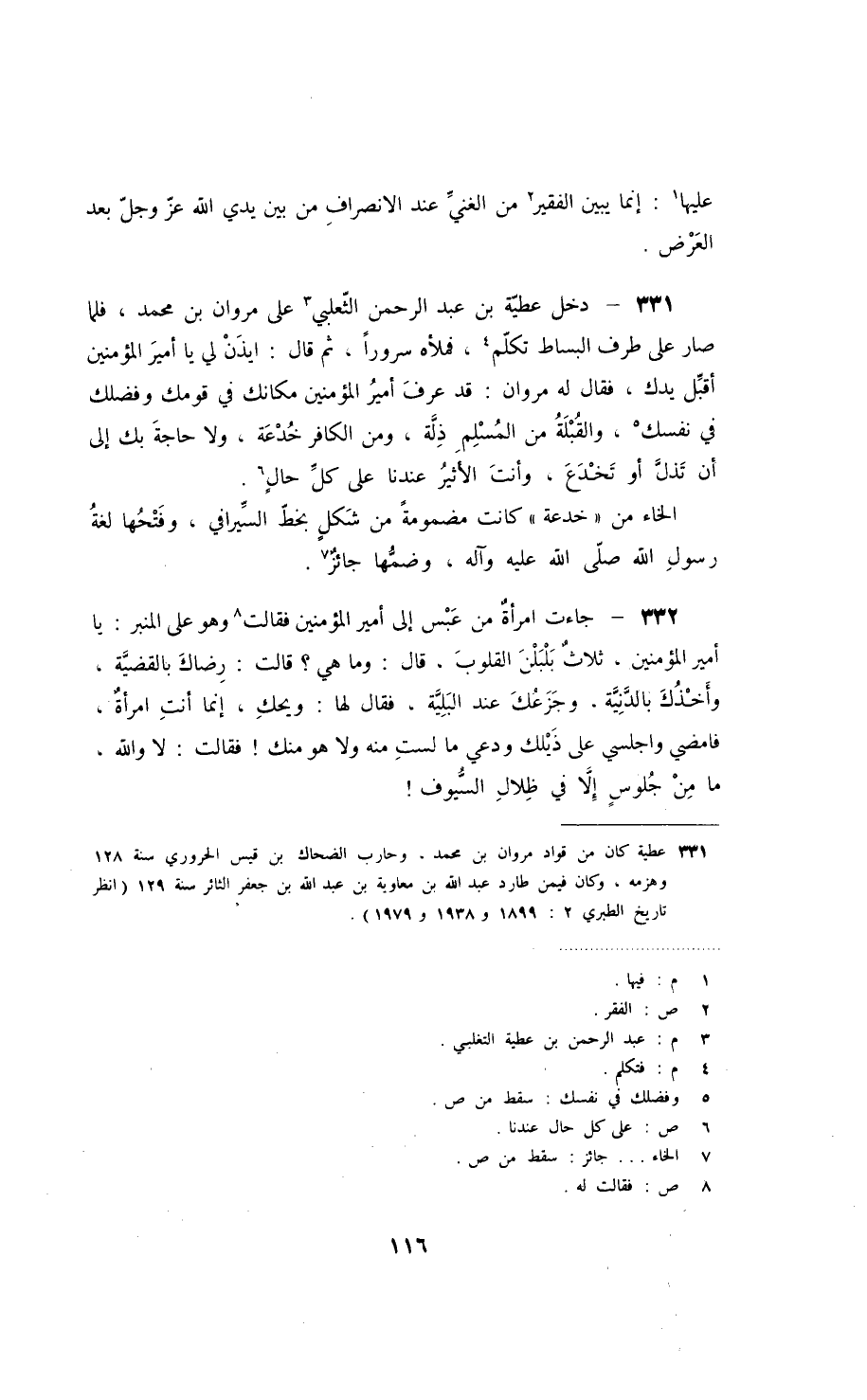 دخل عطيّة بن عبد الرحمن الثّعلبي على مروان بن محمد، فلما صار على طرف البساط تكلّم، فملأه سروراً، ثم قال: ايذن لي يا أمير المؤمنين أقبّل يدك، فقال له مروان: قد عرف أمير المؤمنين مكانك في قومك وفضلك في نفسك، والقبلة من المسلم ذلّة، ومن الكافر خدعة، ولا حاجة بك إلى أن تذلّ أو تخدع، وأنت الأثير عندنا على كلً حالٍ الخاء من خدعة كانت مضمونة من شكل بخط السيراني وفتحها لغة رسول الله صلى الله عليه وسلم وضمها جائز.