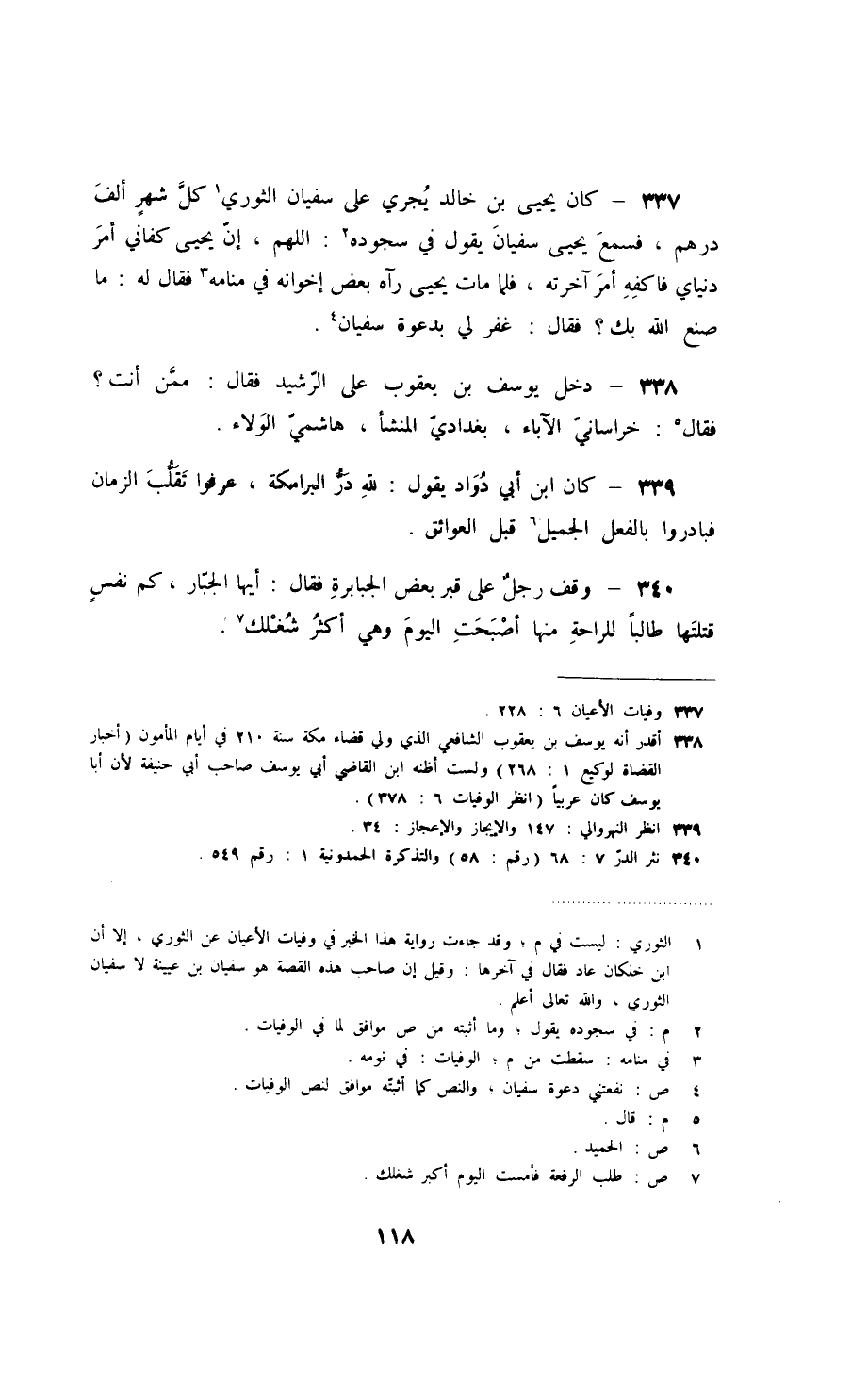 كان يحيى بن خالد يجري على سفيان الثوري كلّ شهرٍ ألف درهم، فسمع يحيى سفيان يقول في سجوده: اللهم، إنّ يحيى كفاني أمر دنياي فاكفه أمر آخرته، فلما مات يحيى رآه بعض إخوانه في منامه فقال له: ما صنع الله بك؟ فقال: غفر لي بدعوة سفيان.