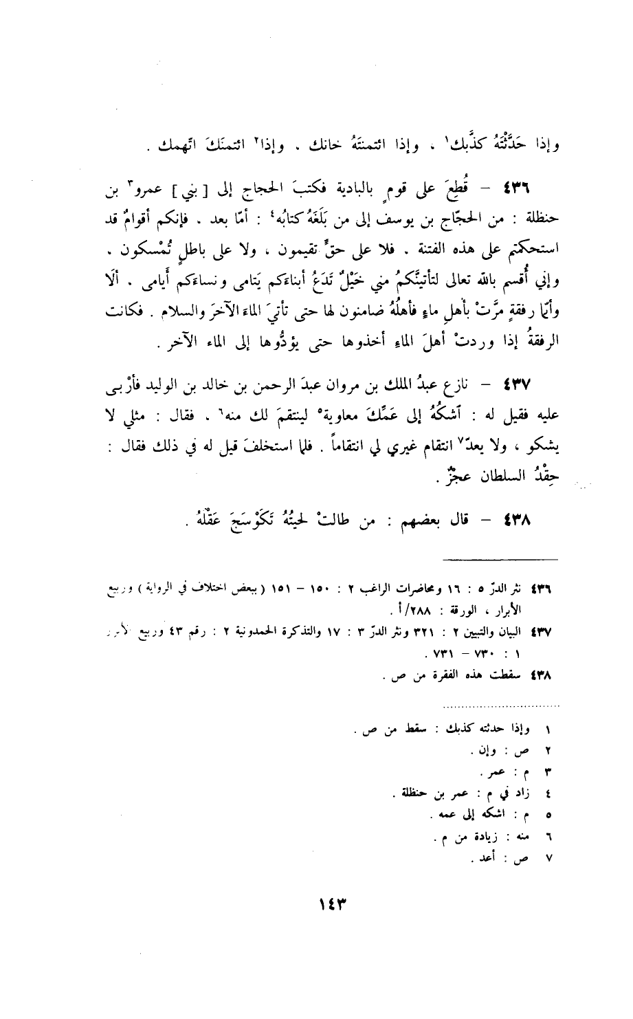 قطع على قومٍ بالبادية فكتب الحجاج إلى بني عمرو بن حنظلة: من الحجّاج بن يوسف إلى من بلغه كتابه: أمّا بعد، فإنكم أقوامٌ قد استحكمتم على هذه الفتنة، فلا على حقٍّ تقيمون، ولا على باطلٍ تمسكون، وإني أقسم بالله تعالى لتأتينّكم مني خيلٌ تدع أبناءكم يتامى ونساءكم أيامى، ألا وأيّما رفقةٍ مرّت بأهل ماءٍ فأهله ضامنون لها حتى تأتي الماء الآخر والسلام. فكانت الرفقة إذا وردت أهل الماء أخذوها حتى يؤدّوها إلى الماء الآخر.
