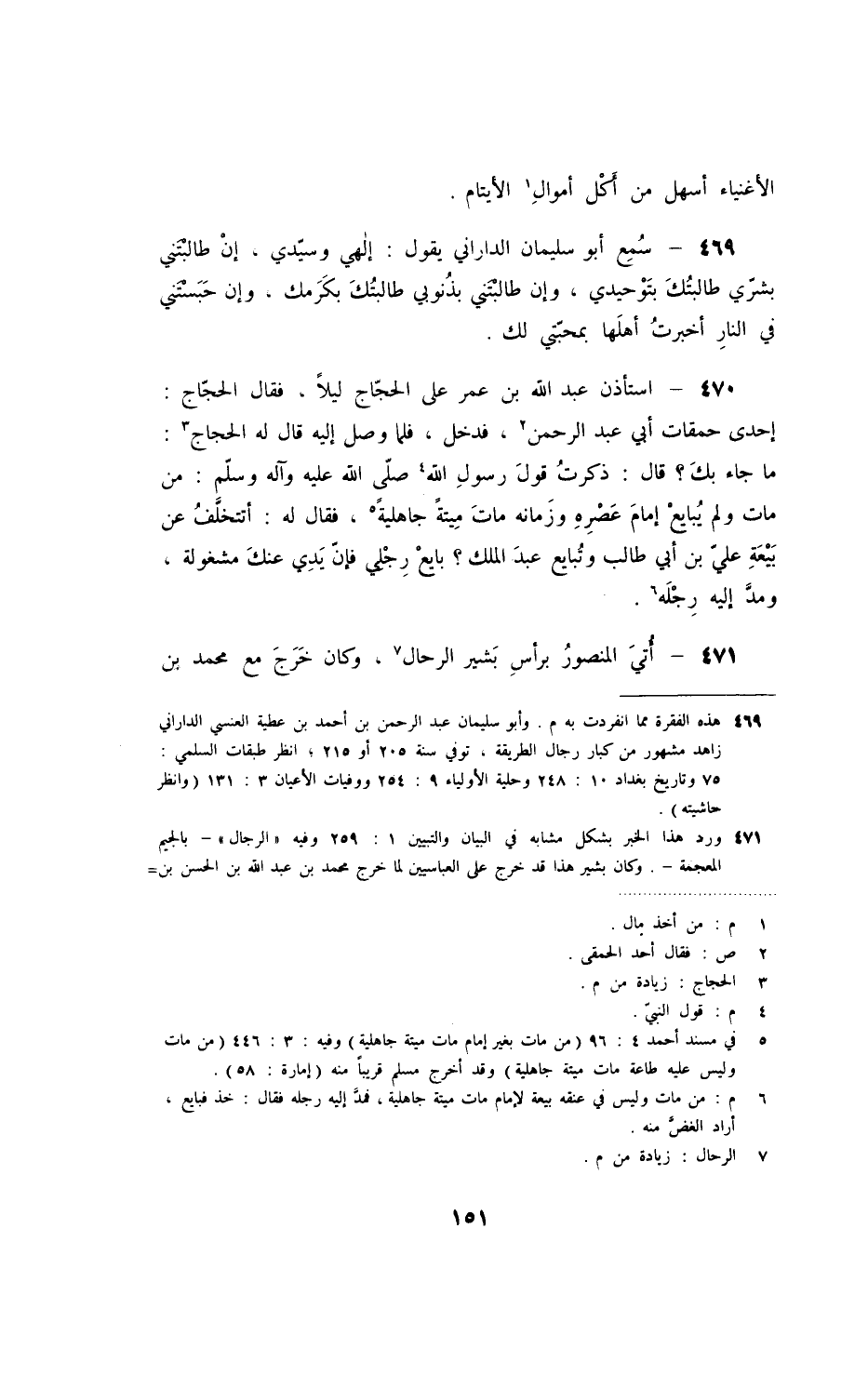 استأذن عبد الله بن عمر على الحجّاج ليلاً، فقال الحجّاج: إحدى حمقات أبي عبد الرحمن، فدخل، فلما وصل إليه قال له الحجّاج: ما جاء بك؟ قال: ذكرت قول رسول الله صلّى الله عليه وآله وسلّم: " من مات ولم يبايع إمام عصره وزمانه مات ميتةً جاهليةً "، فقال له: أتتخلّف عن بيعة عليّ بن أبي طالب وتبايع عبد الملك؟ بايع رجلي فإنّ يدي عنك مشغولة، ومدٌ إليه رجله.