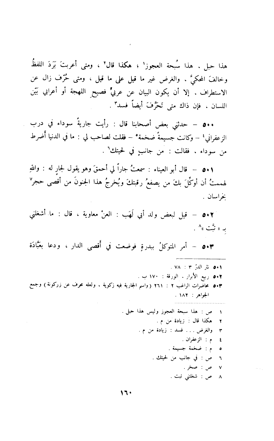 هذا حبل، هذا سبحة العجوز؛ هكذا قال، ومتى أعربت برد اللفظ وخالف المحكيّ، والغرض غير ما قيل على ما قيل، ومتى حرّف زال عن الاستطراف، إلا أن يكون البيان عن عربيٍّ فصيح اللهجة أو أعرابي بيّن اللسان، فإن ذاك متى تحّرف أيضاً فسد.