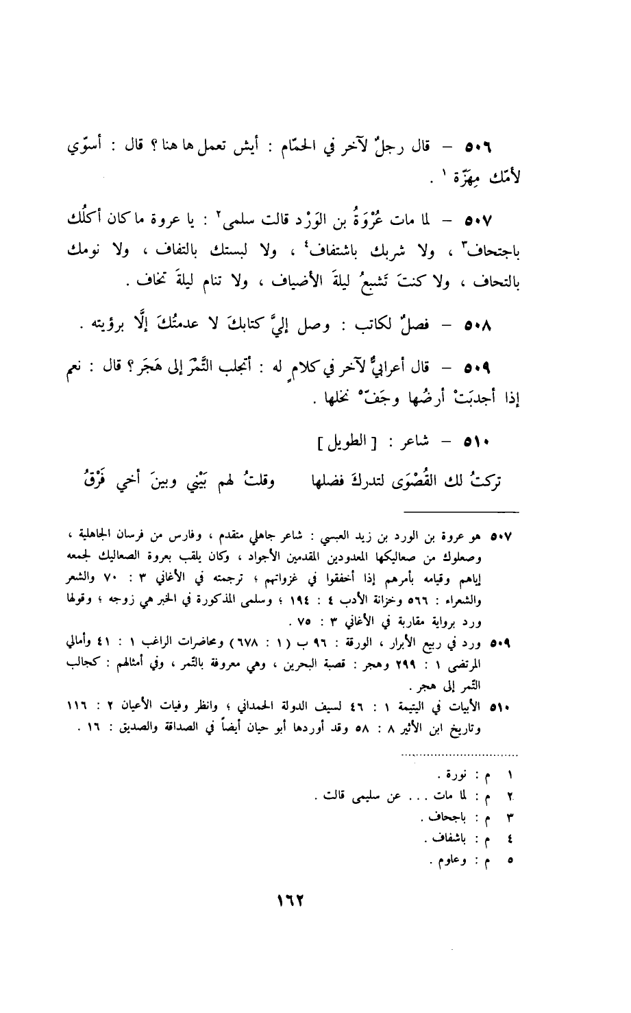 لما مات عروة بن الورد قالت سلمى: يا عروة ما كان أكلك باجتحاف، ولا شربك باشتفاف، ولا لبستك بالتفاف، ولا نومك بالتحاف، وال كنت تشبع ليلة الأضياف، ولا تنام ليلةً تخاف.
