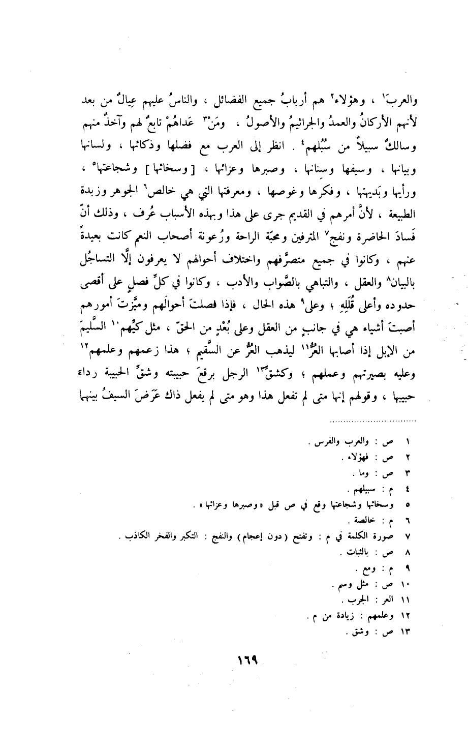 والعرب، وهؤلاء هم أرباب جميع الفضائل، والناس عليهم عيالٌ من بعد لأنهم الأركان والعمد والجراثيم والأصول، ومن عداهم تابعٌ لهم وآخذٌ منهم وسالكٌ سبيلاً من سبلهم. انظر إلى العرب مع فضلها وذكائها، ولسانها وبيانها، وسيفها وسنانها، وصبرها وعزائها، وسخائها وشجاعتها، ورأيها وبديهتها، وفكرها وغوصها، ومعرفتها التي هي خالص الجوهر وزبدة الطبيعة، لأنّ أمرهم في القديم جرى على هذه وبهذه الأسباب عرف، وذلك أنّ فساد الحاضرة ونفج المترفين ومحبّ الراحة ورعونة أصحاب النعم كانت بعيدةً عنهم، وكانوا في جميع متصرّفهم واختلاف أحوالهم لا يعرفون إّلا التساجل بالبيان والعقل، والتباهي بالصّواب والأدب، وكانوا في كلّ فصلٍ على أقصى حدوده وأعلى قلله، وعلى هذه الحال، فإذا فصلت أحوالهم وميّزت أمورهم أصبت أشياء هي في جانبٍ من العقل وعلى بعدٍ من الحقّ، مثل كيّهم السّليم من الإبل إذا أصابها العرّ ليذهب العرّ عن السّقيم؛ هذا زعمهم وعلمهم وعليه بصيرتهم وعملهم؛ وكشقّ الرجل برقع حبيبته وشقّ الحبيبة رداء حبيبها، وقولهم إنها متى لم تفعل هذا وهو متى لم يفعل ذاك عرض السيف بينهما