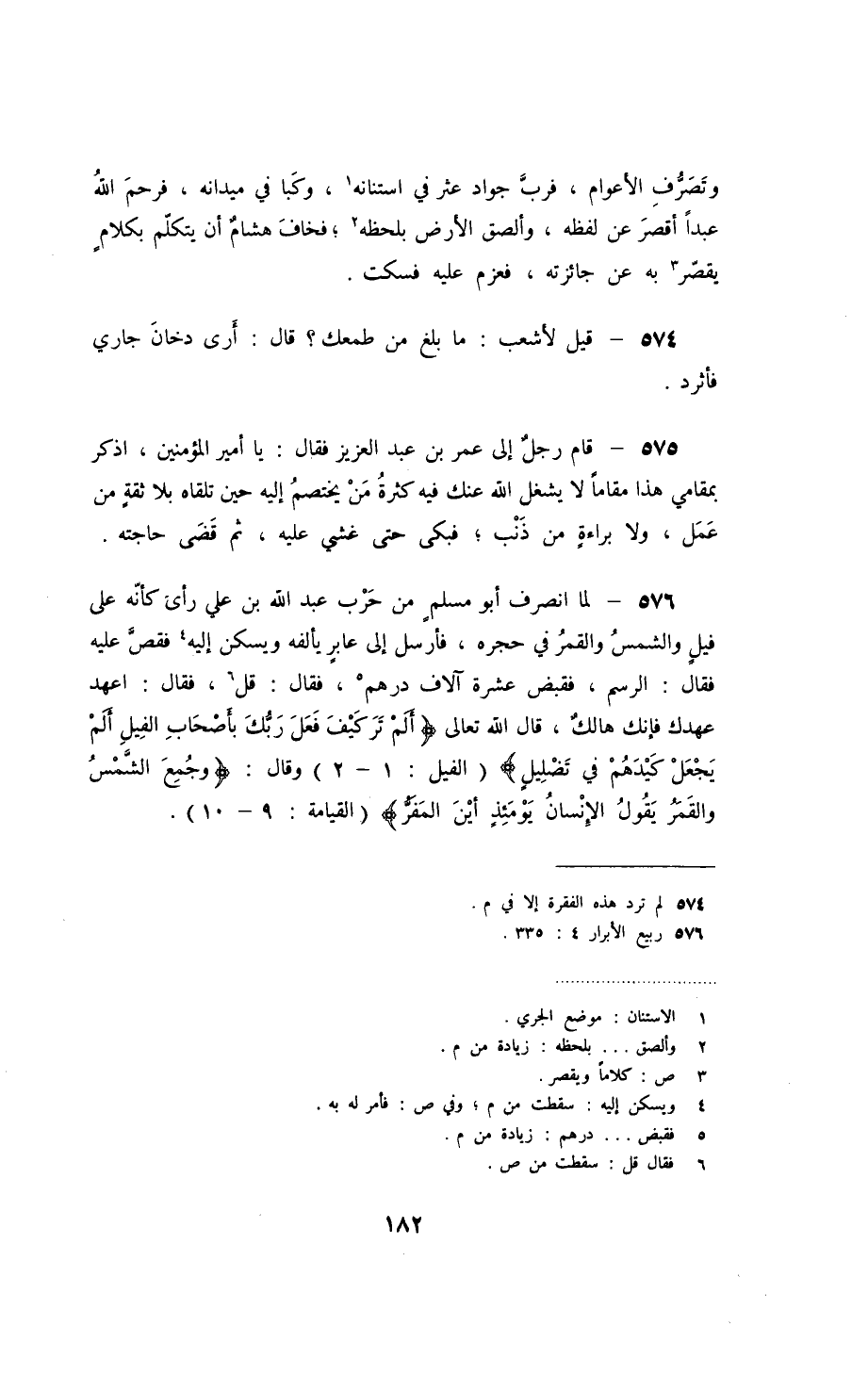 وتصرّف الأعوام، فربّ جواد عثر في استنانه، وكبا في ميدانه، فرحم الله عبداً أقصر عن لفظه، وألصق الأرض بلحظه؛ فخاف هشامٌ أن يتكلّم بكلامٍ يقصّر به عن جائزته، فعزم عليه فسكت.