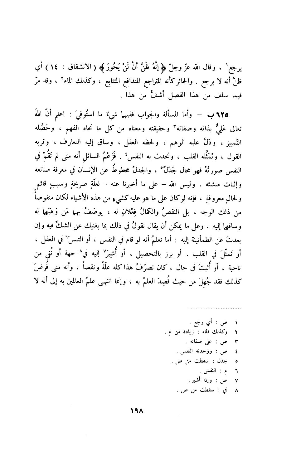 625 - وأما المسألة والجواب ففيهما شيءٌ ما استوفيّ: اعلم أنّ الله تعالى عليٌّ بذاته وصفاته وحقيقته ومعناه من كل ما نحاه الفهم، وحصّله التّمييز، ودلّ عليه الوهم، ولحظه العقل، وساق إليه التعارف، وقربه القول، وتمثّله القلب، وتحدث به النفس. فزعم السائل أنه متى لم تقم في النفس صورته فهو محال جدلٌ، والجدل محطوطٌ عن الإنسان في معرفة صانعه وإثبات منشئه، وليس الله - على ما أخبرنا عنه - لعلّةٍ صريحةٍ وسببٍ قائمٍ ولحالٍ معروفةٍ، فإنه لو كان على ما هو عليه كشيءٍ من هذه الأشياء لكان منقوصاً من ذلك الوجه، بل النقص والكمال فعلان له، يوسف بهما من وهبهما له وساقهما إليه، وعلى ما يمكن أن يقال نقول في ذلك بما يغنيك عن الشكّ فيه وإن بعدت عن الطمأنينة إليه: أما تعلم أنه لو قام في النفس، أو التبس في العقل، أو تمثّل في القلب، أو برز بالتحصيل، أو أشير إليه في جهةٍ أو نفي من ناحية، أو أثبت في حال، كان تصرّف هذا كله علّةً ونقصاً، وأنه متى فرض كذلك فقد جهل من حيث قصد العلم به؛ وإنما انتهى العالمين به إلى أنه لا