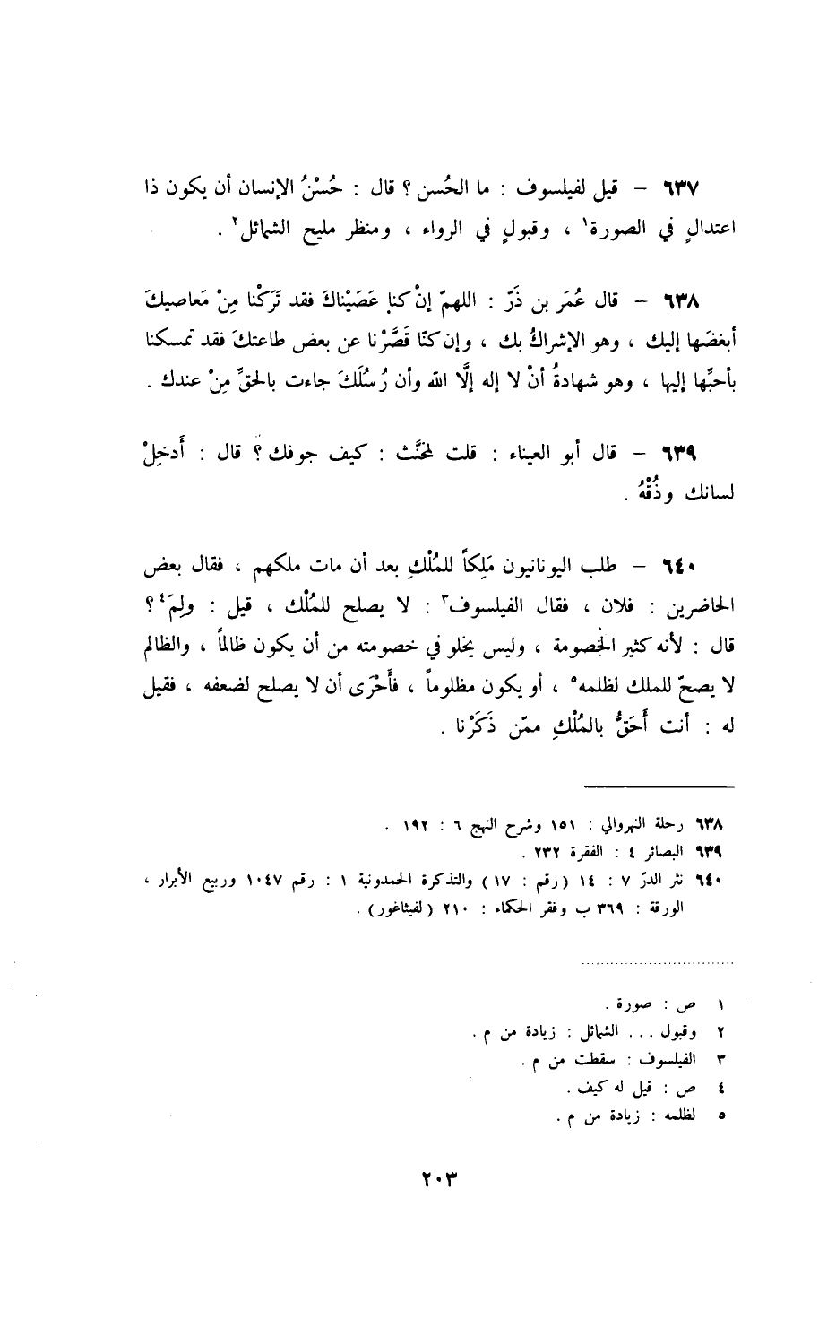 طلب اليونانيون ملكاً للملك بعد أن مات ملكهم، فقال بعض الحاضرين: فلان الفيلسوف: لا يصلح للملك، قيل: ولم؟ قال: لأنه كثير الخصومة، وليس يخلو في خصومته من أن يكون ظالماً، والظالم لا يصحّ للملك لظلمه، أو يكون مظلوماً، فأحرى أن لا يصلح لضعفه، فقيل له: أنت أحقّ بالملك ممّن ذكرنا.