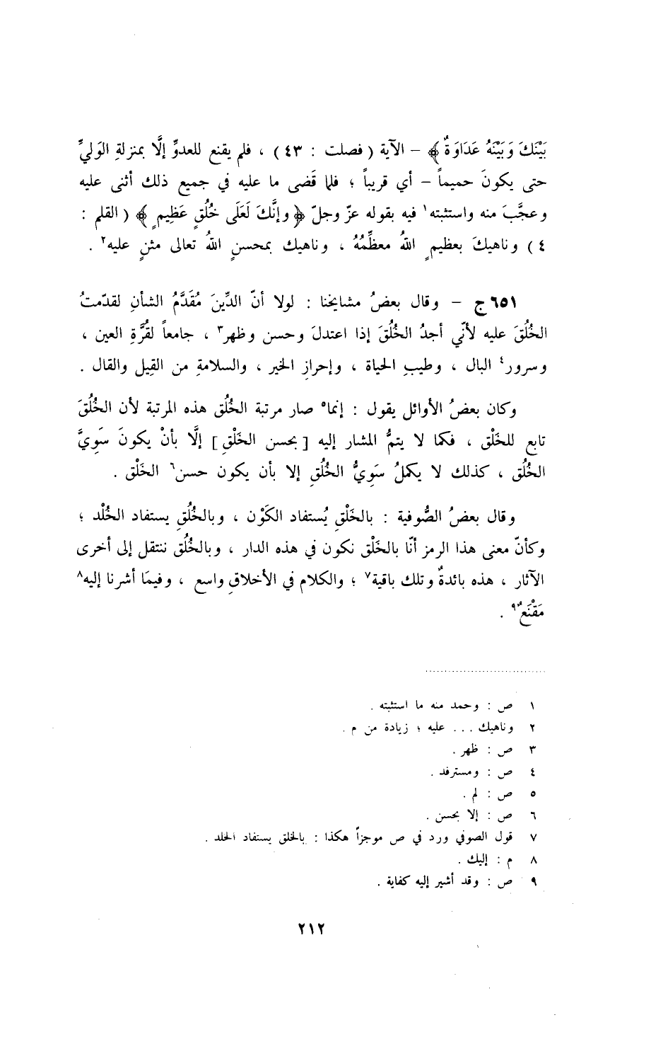 651ج - وقال بعض مشايخنا: لولا أنّ الدّين مقدّم الشأن لقدّمت الخلق عليه لأنّي أجد الخلق إذا اعتدل وحسن وظهر، جامعاً لقرّة العين، وسرور البال، وطيب الحياة، وإحراز الخير، والسلامة من القيل والقال.