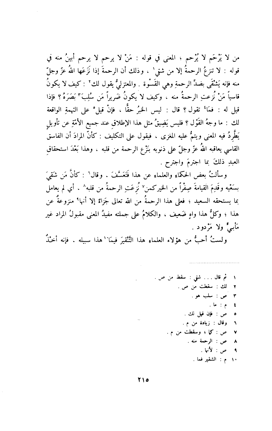وسألتبعض الحكماء والعلماء عن هذا فتعسّف، وقال: كأنّ من شقي بسعيه وقدم القيامة صفراً من الخير كمن نزعت الرحمة من قلبه، أي لم يعامل بما يستحقه السعيد؛ فعلى هذا الرحمة من الله تعالى جزاءٌ إلا أنها منزوعةٌ عن هذا؛ وكلّ هذا واهٍ ضعيف، والكلام على جملته مفيد المعنى مقبول المراد غير مأبيٍّ ولا مردود.