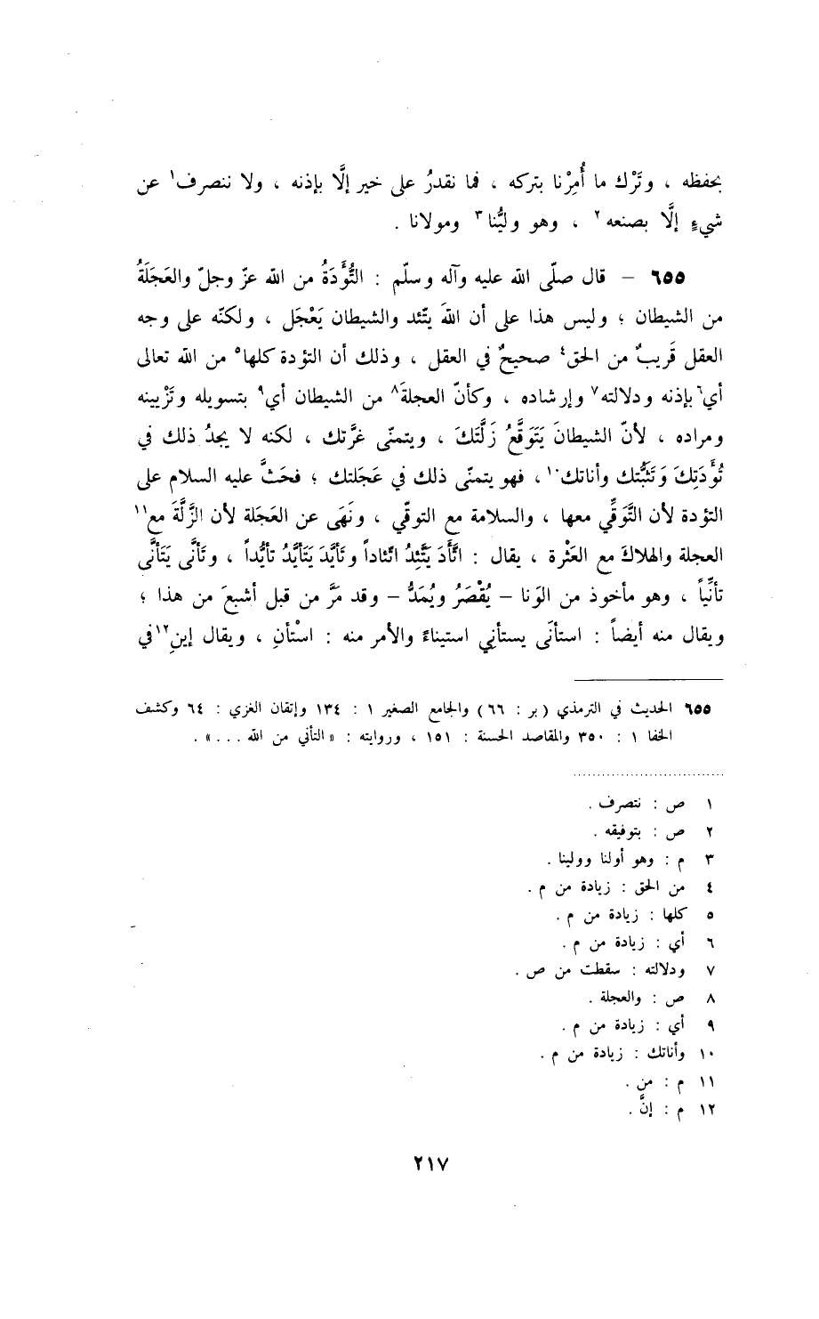 قال صلّى الله عليه وآله وسلّم: " التّؤدة من الله عزّ وجلّ والعجلة من الشيطان "؛ وليس هذا على أن الله يتئد والشيطان يعجل، ولكنّه على وجه العقل قريبٌ من الحق صحيحٌ في العقل، وذلك أن التؤدة كلها من الله تعالى أي بإذنه ودلالته وإرشاده، وكأن العجلة من الشيطان أي بتسويله وتزيينه ومراده، لأنّ الشيطان يتوقّع زلّتك، ويتمنّى غرّتك، لكنه لا يجد ذلك في تؤدتك وتثبّتك وأناتك، فهو يتمنّى ذلك في عجلتك؛ فحثّ عليه السلام على التؤدة لأن التّوقّي معها، والسلامة مع التوقّي، ونهى عن العجلة لأن الزّلّة مع العجلة والهلاك مع العثرة، يقال: اتّأد يتّئد اتّئاداً وتأيّد يتأيّد تأيّداً، وتأنّى يتأنّى تأنّياً، وهو مأخوذ من الونا - يقصر ويمدّ - وقد مرّ من قبل أشبع من هذا؛ ويقال منه أيضاً: استأنى يستأني استيناءً والأمر منه: استأن، ويقال إين في