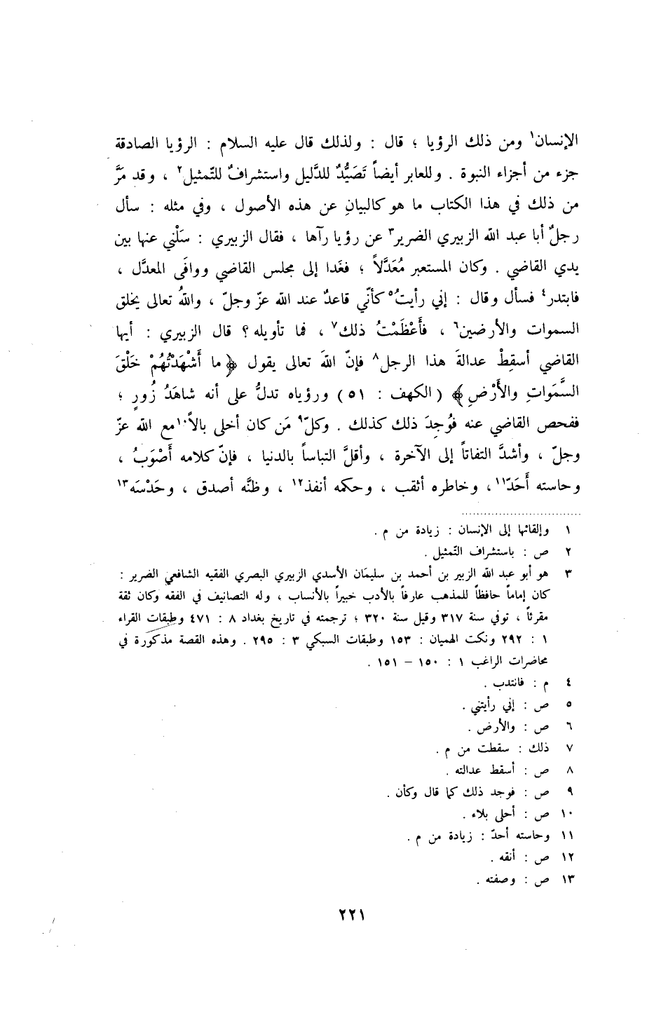 الإنسان ومن ذلك الرؤيا؛ قال: ولذلك قال عليه السلام: الرؤيا الصادقة جزء من أجزاء النبوة. وللعابر أيضاً تصيّدٌ للدّليل واستشرافٌ للتمثيل، وقد مرّ من ذلك في هذا الكتاب ما هو كالبيان عن هذه الأصول، وفي مثله: سأل رجلٌ أبا عبد الله الزبيري الضرير عن رؤيا رآها، فقال الزبيري: سلني عنها بين يدي القاضي. وكان المستعير معدّلاً؛ فغدا إلى مجلس القاضي ووافى المعدّل، فابتدر فسأل وقال: إني رأيت كأنّي قاعدٌ عند الله عزّ وجلّ، والله تعالى يخلق السموات والأرضين، فأعظمت ذلك، فما تأويله؟ قال الزبيري: أيها القاضي أسقط عدالة هذا الرجل فإنّ الله تعالى يقول " ما أشهدتهم خلق السّموات والأرض " ورؤياه تدلّ على أنه شاهد زورٍ؛ ففحص القاضي عنه فوجد ذلك كذلك. وكلّ من كان أخلى بالاً مع الله عزّ وجلّ، وأشدّ التفاتاً إلى الآخرة، وأقلّ التباساّ بالدنيا، فإنّ كلامه أصوب، وحاسته أحدّ، وخاطره أثقب، وحكمه أنفذ، وظنّه أصدق، وحدسه