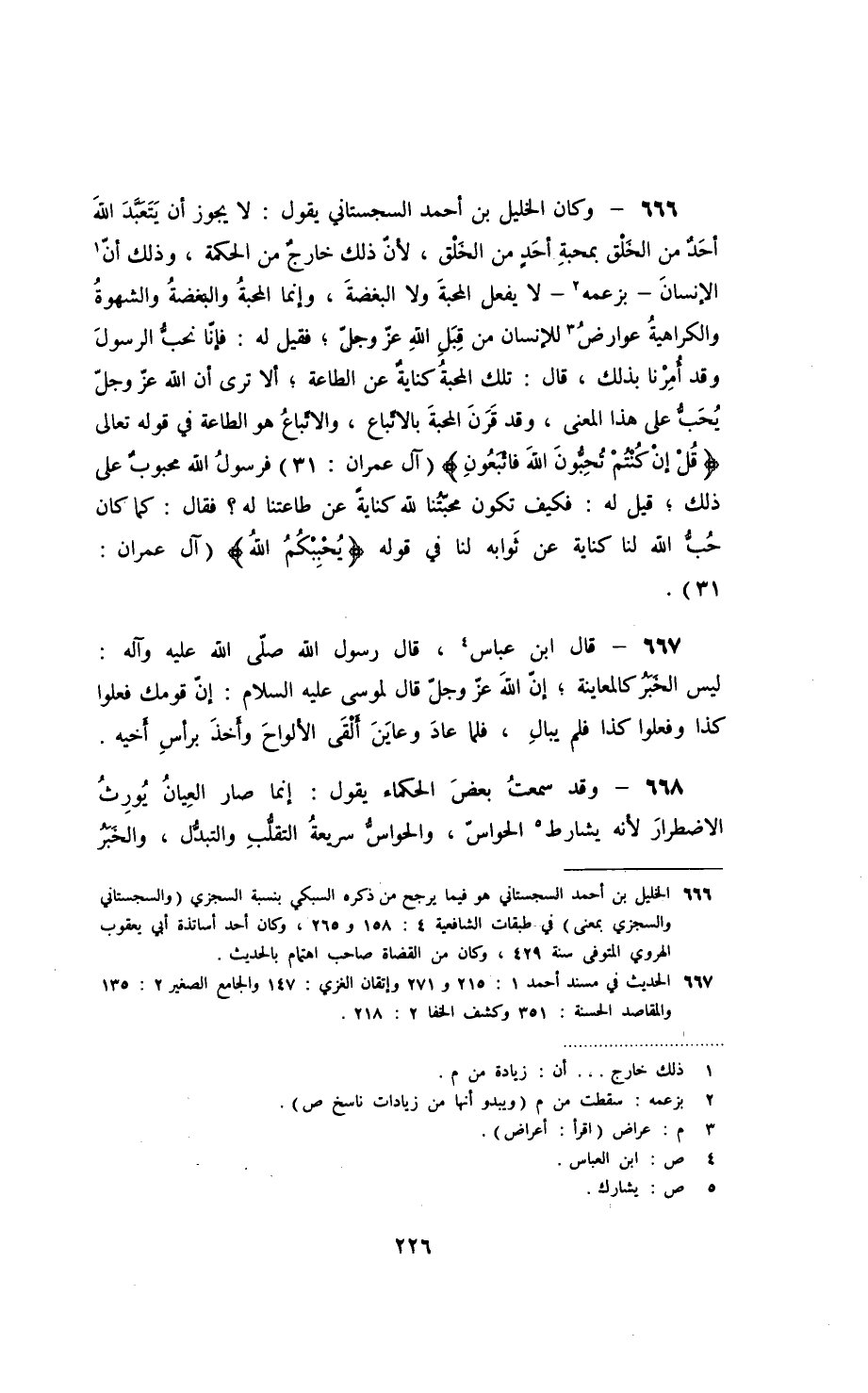 وكان الخليل بن أحمد السجستاني يقول: لا يجوز أن يتعبّد الله أحد من الخلق بمحبة أحدٍ من الخلق، لأن ذلك خارجٌ من الحكمة، وذلك أنّ الإنسان - بزعمه - لا يفعل المحبة ولا البغضة، وإنما المحبة والبغضة والشهوة والكراهية عوارض للإنسان من قبل الله عزّ وجلّ؛ فقيل له: فإنّا نحبّ الرسول وقد أمرنا بذلك، قال: تلك المحبة كنايةٌ عن الطاعة؛ ألا ترى أن الله عزّ وجلّ يحبّ على هذا المعنى، وقد قرن المحبة بالاتّباع، والاتّباع هو الطاعة في قوله تعالى " قل إن كنتم تحبّون الله فاتبعون " فرسول الله محبوبٌ على ذلك؛ قيل له: فكيف تكون محبتنا لله كنايةً عن طاعتنا له؟ فقال: كما كان حبّ الله لنا كناية عن ثوابه لنا في قوله " يحببكم الله ".