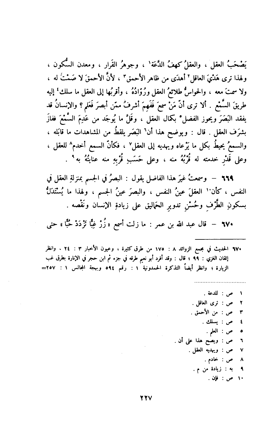 يصحب العقل، والعقل كهف الدّعة، وجوهر القرار، ومعدن السّكون، ولهذا ترى هدي العاقل أهدى من ظاهر الأحمق، لأنّ الأحمق لا صمت له، ولا سمت معه، والحواسّ طلائع العقل وروّاده، وأقربها إلى العقل ما سلك إليه طريق السّمع. ألا ترى أنّ من سمع ففهم أشرف ممّن أبصر فعلم؟ والإنسان قد يفقد البصر ويجوز الفضل بكمال العقل، وقلّ ما يوجد من عدم السّمع ففاز بشرف العقل. قال: ويوضح هذا أن البصر يلقط من المشاهدات ما قابله، والسمع يحيط بكل ما يرعاه ويهديه إلى العقل، فكأنّ السمع أخدم للعقل، وعلى قدر خدمته له قربه منه، وعلى حسب قربه منه عنايته به.