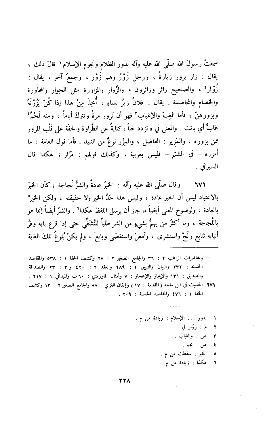 سمعت رسول الله صلّى الله عليه وآله بدور الظلام ونجوم الإسلام قال ذلك؛ يقال: زار يزور زيارةً، ورجل زورٌ وهم زور، وجمعٌ آخر، يقال: زوّار، والصحيح زائر وزائرون؛ والزّوار والمزاورة مثل الحوار والمحاورة والخصام والمخاصمة. يقال: فلانٌ زير نساءٍ: أخذ من هذا إذا كنّ يزرنه ويزورهنّ؛ فأما الغبّ والإغباب فهو أن تزور مرةً وتترك أياماً، ومنه لحمٌ غابٌّ أي بائت. والمعنى في " تزدد حباً " كنايةٌ عن الطّراوة والخفّة على قلب المزور ممن يزوره، والمزير: الفاضل؛ والمزر نوعٌ من النبيذ. فأما قول العامة: ما أمزره - في الشتم - فليس بعربية -، وكذلك قولهم: مزّار؛ هكذا قال السيرافي.
