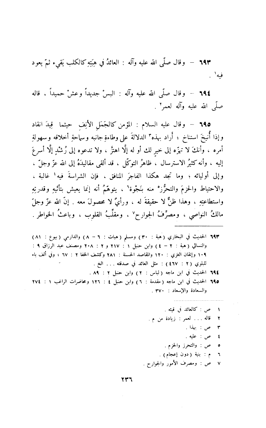وقال عليه السلام: " المؤمن كالجمل الأنف حيثما قيد انقاد وإذا أنيخ استناخ "؛ أراد بهذه الدلالة على وطاءة جانبه وسماحة أخلاقه وسهولة أمره، وأنك لا تهزّه إلى خيرٍ لك أو له إّلا اهتزّ، ولا تدعوه إلى رشدٍ إّلا أسرع إليه، وأنه كثير الاسترسال، ظاهر التوكّل، قد ألقى مقاليده إلى الله عزّ وجلّ، وإلى أوليائه؛ وما تجد هكذا الفاجر المنافق، فإن الشراسة فيه غالبة، والاحتياط والحزم والتحرّز منه بنجوة، يتوهّم أنه إنما يعيش بتأتّيه وقدرته واستطاعته، وهذا ظنّ لا حقيقة له، ورأيٌ لا محصول معه. إنّ الله عزّ وجلّ مالك النواصي، ومصرّ ف الجوارح، ومقلّب القلوب، وباعث الخواطر.