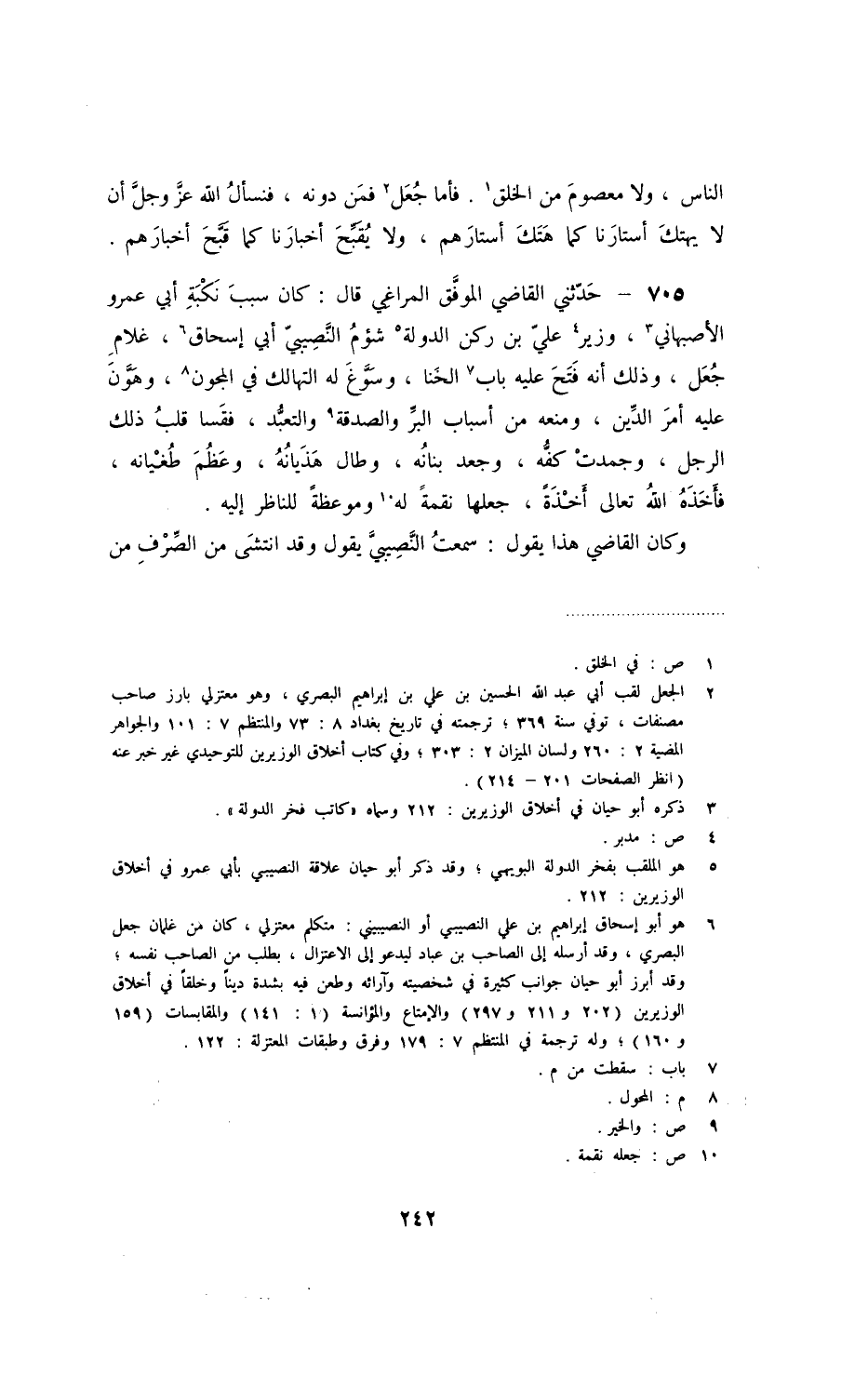 حدّثني القاضي الموفّق المراغي قال: كان سبب نكبة أبي عمرو الأصبهاني، وزير عليّ بن ركن الدولة شؤم النّصيبيّ أبي إسحاق، غلام جعل، وذلك أنه فتح عليه باب الخنا، وسوّغ له التهالك في المجون، وهوّن عليه أمر الدّين، ومنعه من أسباب البّر والصدقة والتعبّد، فقسا قلب ذلك الرجل، وجمدت كفّه، وجعد بنانه، وطال هذيانه، وعظم طغيانه، فأخذه الله تعالى أخذةً، جعلها نقمةً له وموعظةً للناظر إليه.