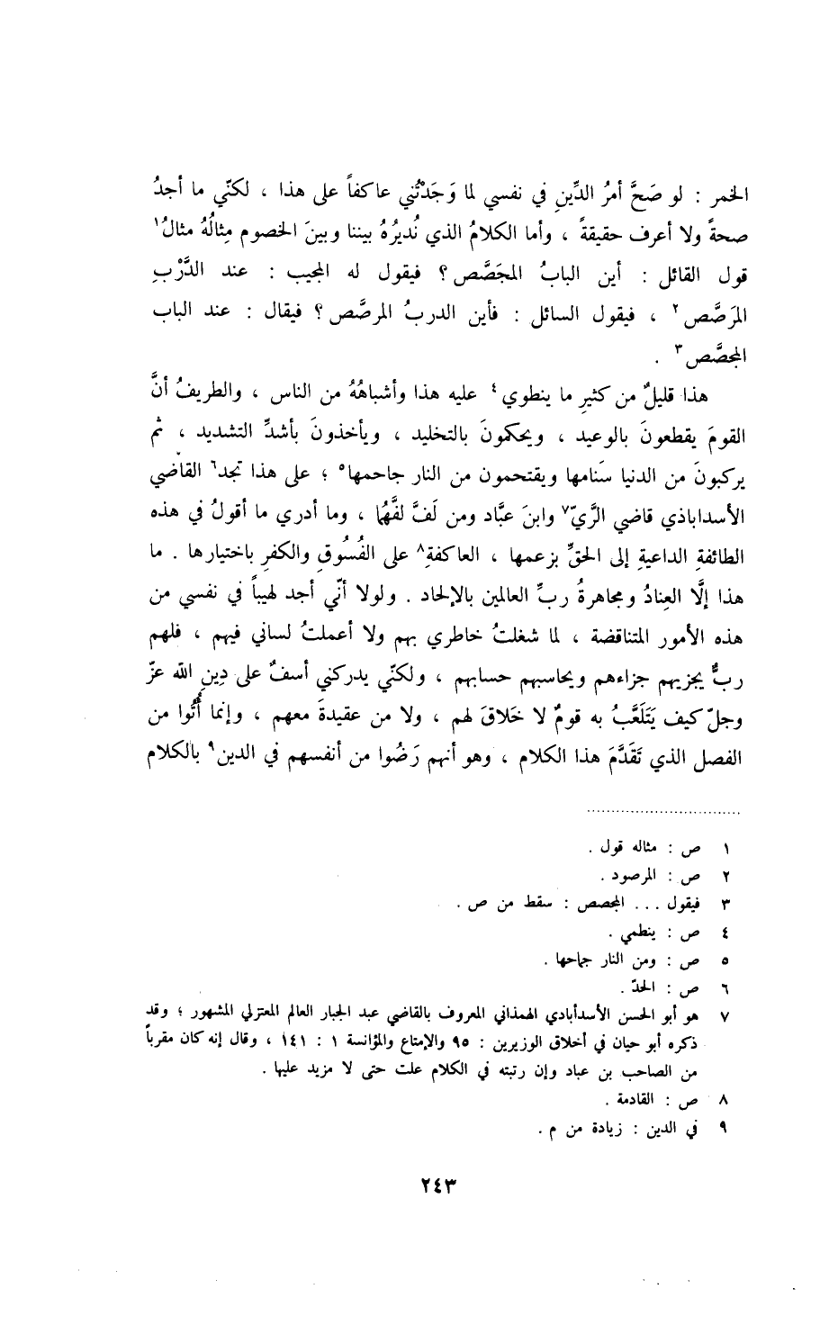 هذا قليلٌ من كثير ما ينطوي عليه هذا وأشباهه من الناس، والطريف أنّ القوم يقطعون بالوعيد، ويحكمون بالتخليد، ويأخذون بأشدّ التشديد، ثم يركبون من الدنيا سنامها ويقتحمون من النار جاحمها؛ على هذا تجد القاضي الأسداباذي قاضي الرّي وابن عبّاد ومن لفّ لفّهما، وما أدري ما أقول في هذه الطائفة الداعية إلى الحقّ بزعمها، العاكفة على الفسوق والكفر باختيارها. ما هذا إّلا العناد ومجاهرة ربّ العالمين بالإلحاد. ولولا أنّي أجد لهيباً في نفسي من هذه الأمور المتناقضة، لما شغلت خاطري بهم ولا أعملت لساني فيهم، فلهم ربّ يجزيهم جزاءهم ويحاسبهم حسابهم، ولكنّي يدركني أسفٌ على دين الله عزّ وجلّ كيف يتلعّب به قومٌ لا خلاق لهم، ولا من عقيدة معهم، وإنما أتوا من الفضل الذي تقدّم هذا الكلام، وهو أنهم رضوا من أنفسهم في الدين بالكلام