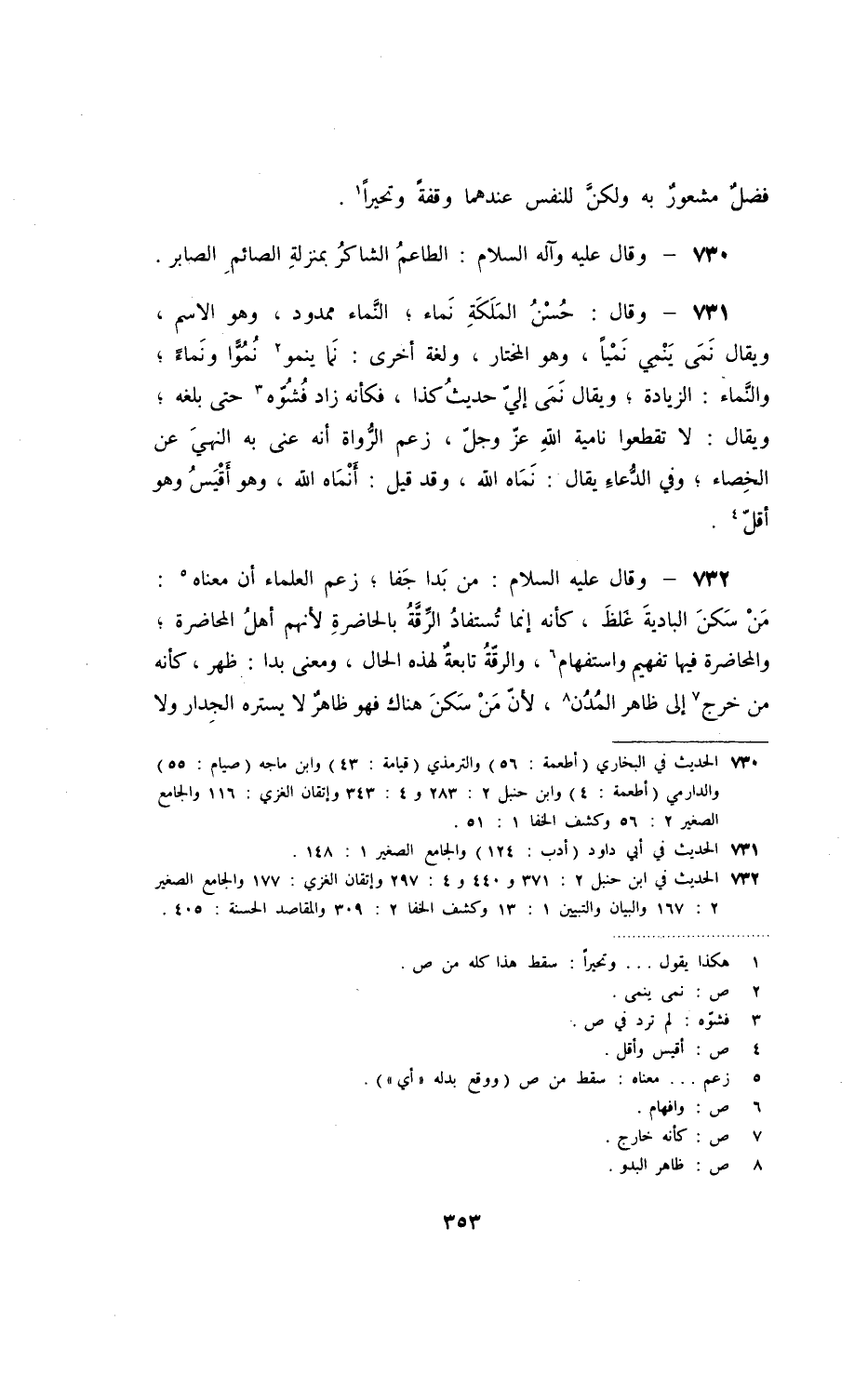 وقال: حسن الملكة نماء؛ النّماء ممدود، وهو الاسم، ويقال نمى ينمي نمياً، وهو المختار، ولغة أخرى: نما ينمو نموّاً ونماءً؛ والنّماء: الزيادة؛ ويقال نمى إليّ حديث كذا، فكأنه زاد فشوّه حتى بلغه؛ ويقال: لا تقطعوا نامية الله عزّ وجلّ، زعم الرّواة أنه عنى به النهي عن الخصاء؛ وفي الدّعاء يقال: نماه الله، وقد قيل: أنماه الله، وهو أقيس وهو أقلّ.