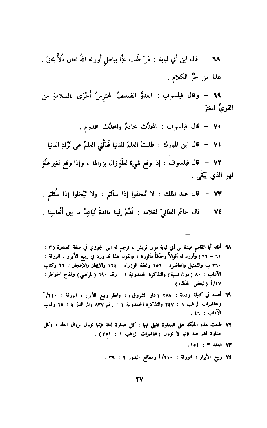 وقال فيلسوف: العدوّ الضعيف المحترس أحرى بالسلامة من القويّ المغترّ.