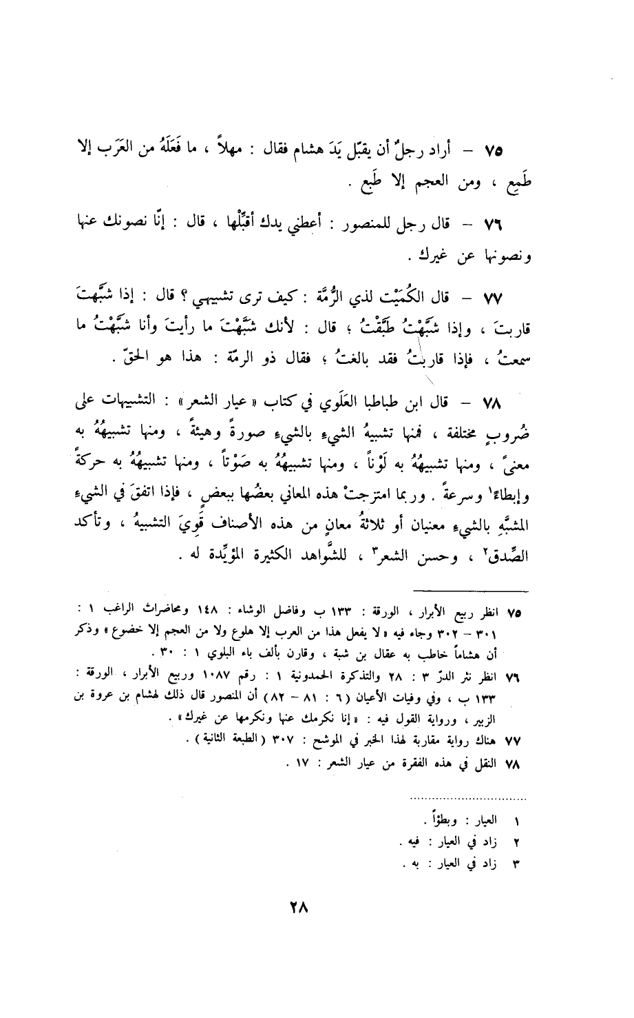قال ابن طباطبا العلوي في كتاب عيار الشعر: التشبيهات على ضروبٍ مختلفة، فمنها تشبيه الشيء بالشيء صورةً وهيئةً، ومنها تشبيهه به معنىً، ومنها تشبيهه به لوناً، ومنها تشبيهه به صوتاً، ومنها تشبيهه به حركةً وإبطاءً وسرعةً. وربما امتزجت هذه المعاني بعضها ببعضٍ، فإذا اتفق في الشيء المشّبه بالشيء معنيان أو ثلاثة معانٍ من هذه الأصناف قوي التشبيه، وتأكد الصّدق، وحسن الشعر، للشّواهد الكثيرة المؤيّدة له.