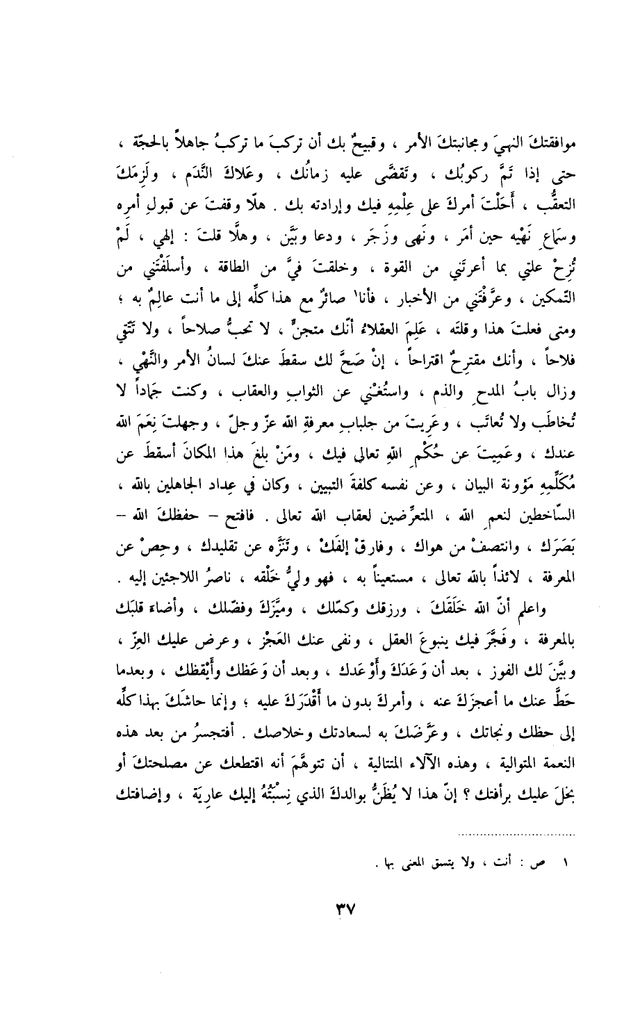 واعلم أن الله خلقك، ورزقك وكمّلك، وميّزك وفضّلك، وأضاء قلبك بالمعرفة، وفجّر فيك ينبوع العقل، ونفى عنك العجز، وعرض عليك العزّ، وبيّن لك الفوز، بعد أن وعدك وأوعدك، وبعد أن وعظك وأيقظك، وبعدما حطّ عنك ما أعجزك عنه، وأمرك بدون ما أقدرك عليه؛ وإنما حاشك بهذا كلّه إلى حظك ونجاتك، وعرّضك به لسعادتك وخلاصك. أفتجسر من بعد هذه النعمة المتوالية، وهذه الآلاء المتتالية، أن تتوهّم أنه اقتطعك عن مصلحتك أو بخل عليك برأفتك؟ إنّ هذا لا يظنّ بوالدك الذي نسبته إليك عارية، وإضافتك