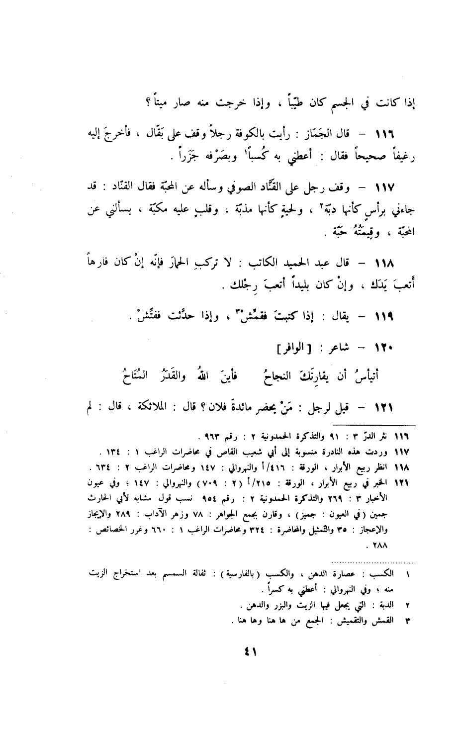 إذا كانت في الجسم كان طيّباً، وإذا خرجت منه صار ميتاً؟ قال الجمّاز: رأيت بالكوفة رجلاً وقف على بقّال، فأخرج إليه رغيفاً صحيحاً فقال: أعطني به كسباً وبصرفه جزراً.