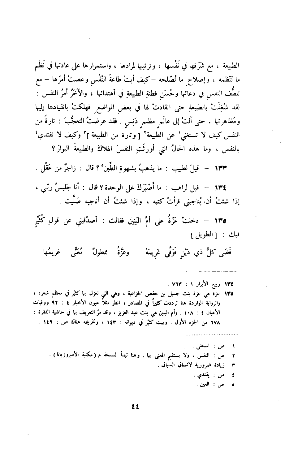 الطبيعة، مع شرفها في نفسها، وترتيبها لمرادها، واستمرارها على عادتها في نظم ما تنظمه، وإصلاح ما تصلحه - كيف أبت طاعة النّفس وعصت أمرها - مع تلطّف النفس في دعائها وحسن فطنة الطبيعة في اهتدائها، والآخر أمر النفس: لقد شغفت بالطبيعة حتى انقادت لها في بعض المواضع فهلكت بانقيادها إليها ومظاهرتها، حتى آلت إلى عالمٍ مظلم دنسٍ. فقد عرضت التعجّب: تارةً من النفس كيف لا تستغني عن الطبيعة وتارة من الطبيعة وكيف لا تقتدي بالنفس، وما هذه الحال التي أورثت النفس الهلاك والطبيعة البوار؟ قيل لطبيب: ما يذهب بشهوة الطّين؟ قال: زاجرٌ من عقل.